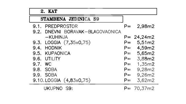 Na prodaju je prostran i moderno dizajniran stan površine 70.37 m2, smješten na II. katu zgrade. Stan se sastoji od prostranog dnevnog boravka s otvorenom kuhinjom i blagovaonicom, koja je obogaćena velikom staklenom stijenom koja pruža nesmetan pogled na zelenilo, te dvije spavaće sobe, toalet, kupaonica, ostava, hodnik i dvije loggie.Stan je opremljen podnim grijanjem u svim prostorijama, ekološkim sustavom za smanjenje potrošnje električne energije te klima uređajima za optimalno hlađenje. Podovi će biti obloženi visokokvalitetnim keramičkim pločicama i laminatom. PVC stolarija je opremljena električnim roletama i staklom punjenim argonom za optimalnu izolaciju. Ulazna vrata su protuprovalna i protupožarna, pružajući osjećaj sigurnosti. Zgrada posjeduje dizalo.Ovaj stan nudi ne samo udoban boravak, već i praktičnost. Uz stan dolaze i dva parkirna mjesta, što ga čini idealnim izborom za moderne životne potrebe.Lokacija stana je izvrsna, s obzirom na blizinu svih potrebnih sadržaja kao što su škola, pošta, restorani, kafići, biciklističke staze, supermarketi, benzinska, apoteka i drugo. More je udaljeno samo 2km od stana, što dodatno povećava atraktivnost ove nekretnine.Cijena stana uključuje PDV, a prodaje se po sistemu "ključ u ruke", što znači da kupci mogu odmah uživati u svim prednostima ove moderno opremljene nekretnine bez dodatnih briga ili troškova. Ovaj stan predstavlja izvrsnu priliku kako za stalni boravak, kao i investiciju u turističke svrhe.