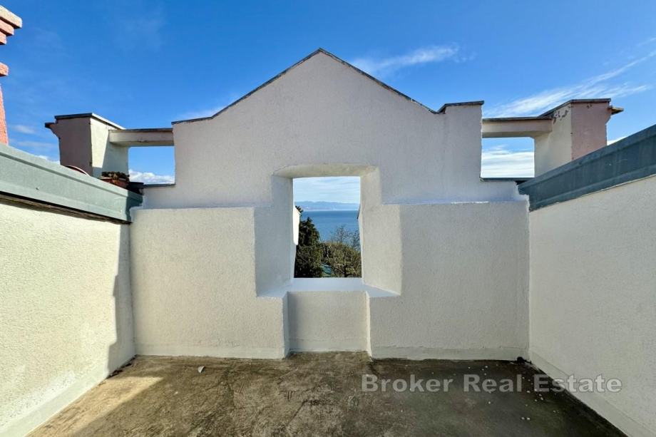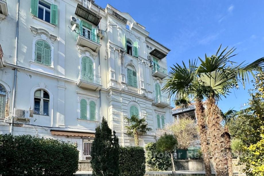 Prodaje se prostran stan površine 94 m², smješten na trećem katu povijesne vile u samom središtu Opatije, u prvom redu do mora. Stan se sastoji od četiri sobe, kuhinje, kupaonice i ograđene vanjske terase s koje se pruža pogled na Kvarnerski zaljev.