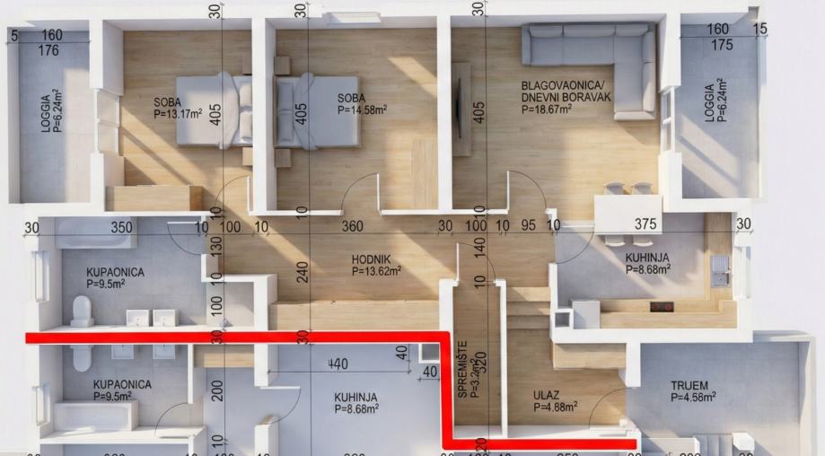 RASPORED KOJI PRATI VAŠE POTREBE: Stan trenutno nudi dvije velike spavaće sobe, prostrani dnevni boravak, kuhinju s blagovaonicom, kupaonicu s podnim grijanjem, hodnik s ugradbenim ormarima, špajzu i dvije loggie.
