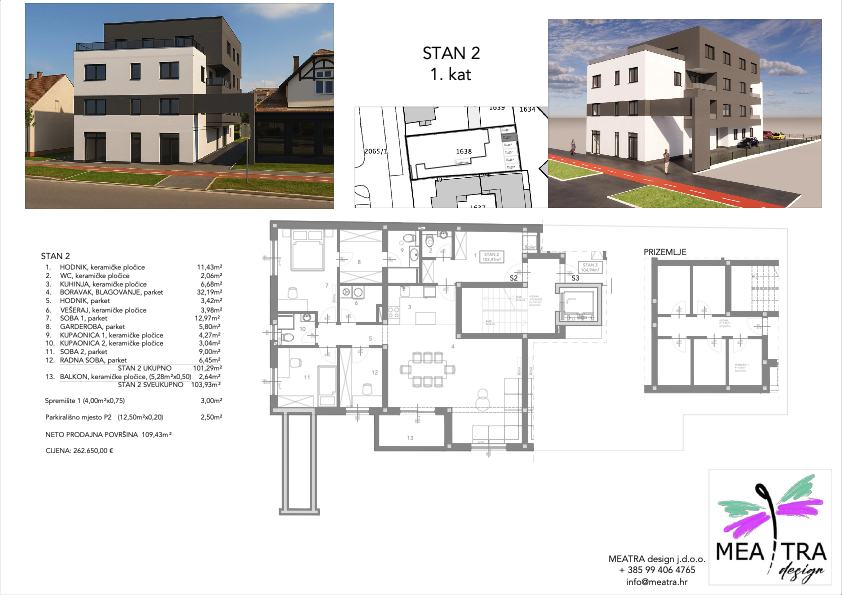 U ulici Tomaša Masaryka u Virovitici prodaje se moderan stan na prvom katu novogradnje, ukupne prodajne površine 109,43 m², s balkonom površine 5,28 m² i liftom u zgradi.