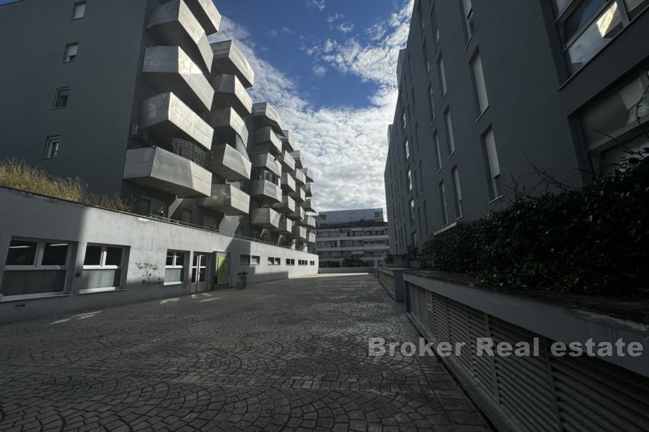 Lokacija stana je idealna za obiteljski život, jer su u neposrednoj blizini svi važni sadržaji poput škola, vrtića, ljekarni i supermarketa, što osigurava lakoću svakodnevnog života. Stan također ima osigurana dva garažna parking mjesta, što je velika prednost s obzirom na sve veću potrebu za parkingom u gradu.