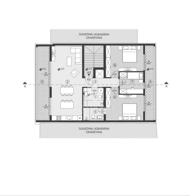 Stan se nalazi na drugom katu novogradnje i sastoji se od tri spavaće sobe, kupaonice, dvije lođe te prostrane dnevne zone koja uključuje kuhinju, blagovaonicu i dnevni boravak. Ovaj ''open space'' koncept stvara osjećaj prostranosti i savršen je za druženja s obitelji i prijateljima.