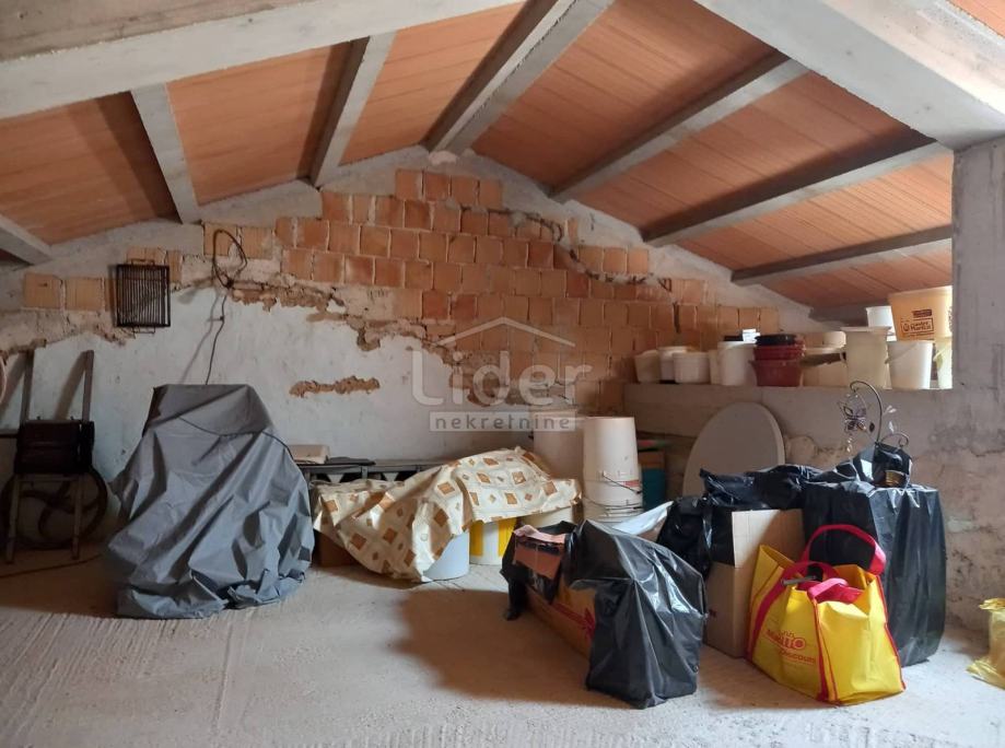 Kuća je dugačka i sastoji se od starog i novog dijela. U prizemlju starog dijela kuće, je stan sa jednom spavaćom sobom, kupaonom, kuhinjom sa dnevnim boravkom i hodnikom. Iz prizemlja se ulazi i u konobu koju treba urediti. Taj dio kuće ima relativno niski strop i gornja međukatna konstrukcija je od drva. Unutarnjim stepenicama dolazimo na kat gdje su dvije spavaće sobe. Iz hodnika poseban ulaz na tavan sa kompletnim novim krovištem i betonskom dekom, gdje se može napraviti moderan stan od sto kvadrata..