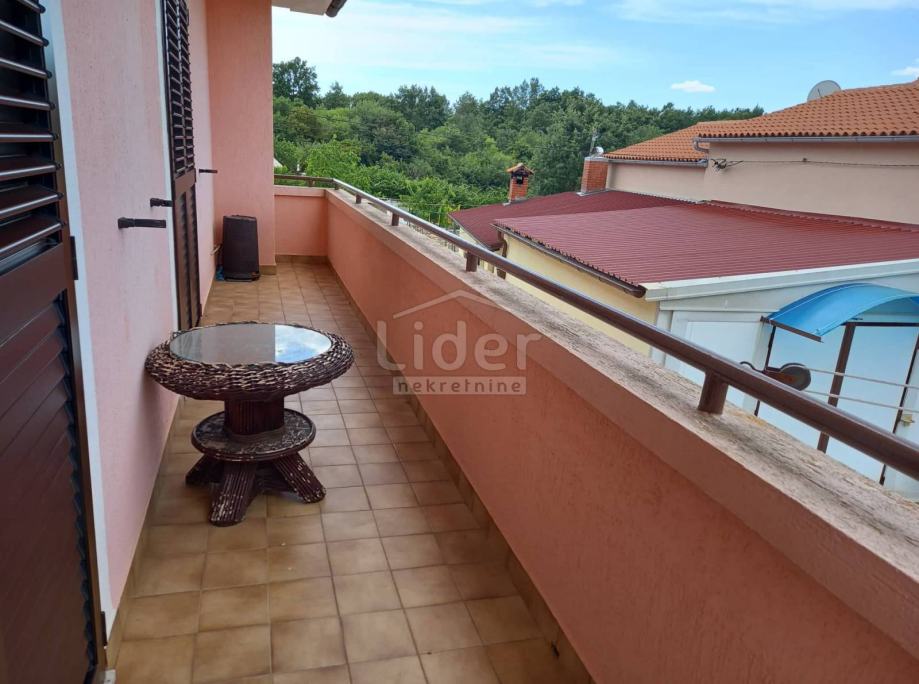 Novi dio kuće smješten je iznad dvije velike garaže i pristup mu je vanjskim velikim otvorenim stubištem. Dolazimo do velikog balkona-terase, na koji vode sve sobe. Sa strane je još jedna manja terasa. U tom stanu imamo prostrani dnevni boravak sa kuhinjom, mali wc, kupaonu, i dvije spavaće sobe sa izlazom na terasu. Taj stan se prodaje namješten.