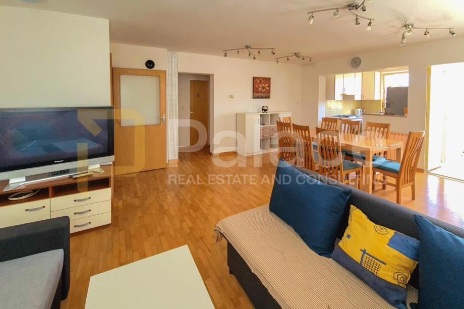Stan na prvom katu (95 m²): 2 spavaće sobe, garderobna soba, dnevni boravak s kuhinjom i blagovaonicom, kupaonica i WC.