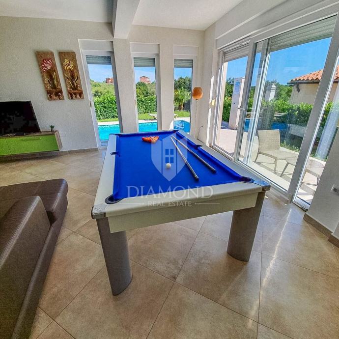 U prizemlju kuće se nalazi open-space kuhinja, blagovaonica, dnevni boravak te kupaonica. Iz velikih staklenih stijena pruža se predivan pogled i izlaz na terasu gdje se nalazi bazen i zeleni vrt sa navodnjavanjem. Stepenicama, ispod kojih se nalazi mala ostava, se odlazi na prvi kat gdje se nalaze 3 prostrane spavaće sobe od kojih jedna ima svoju kupaonicu, dok druge dvije dijele jednu. Na katu se također nalazi balkon na koji se izlazi iz dvije spavaće sobe.