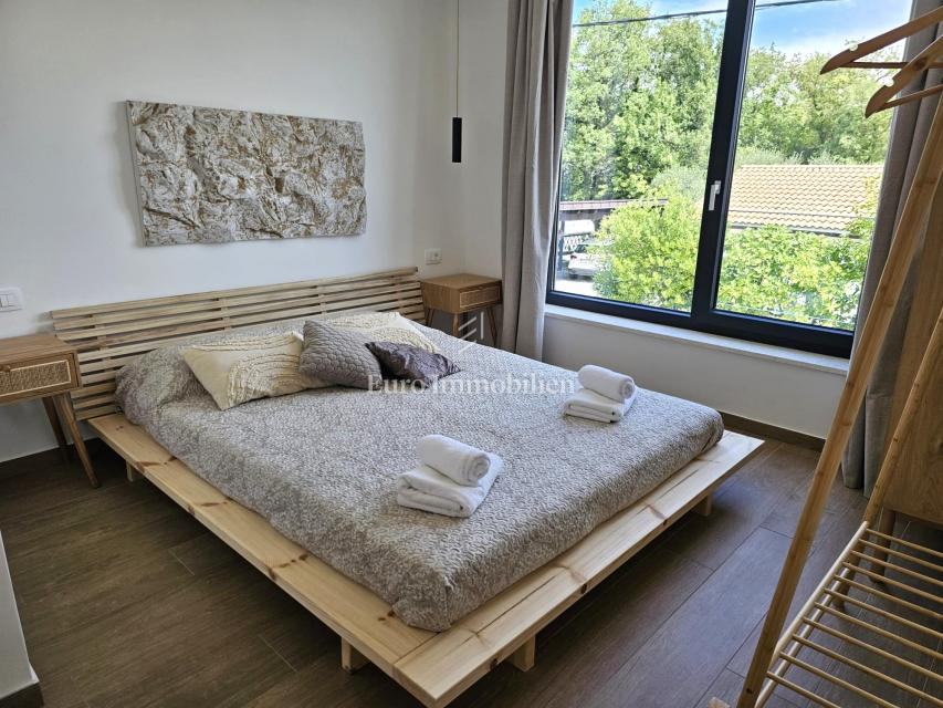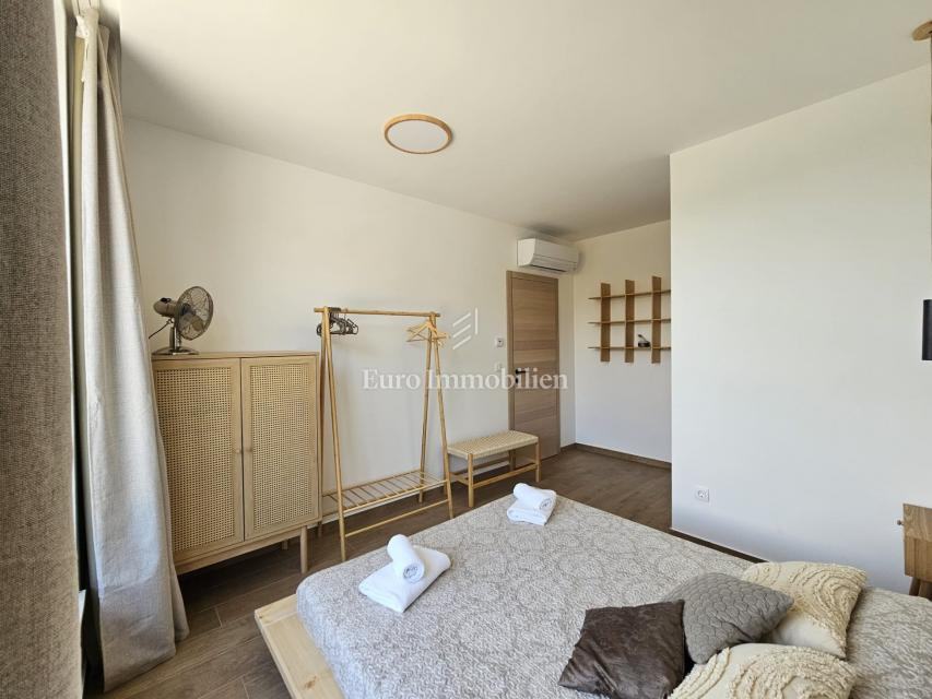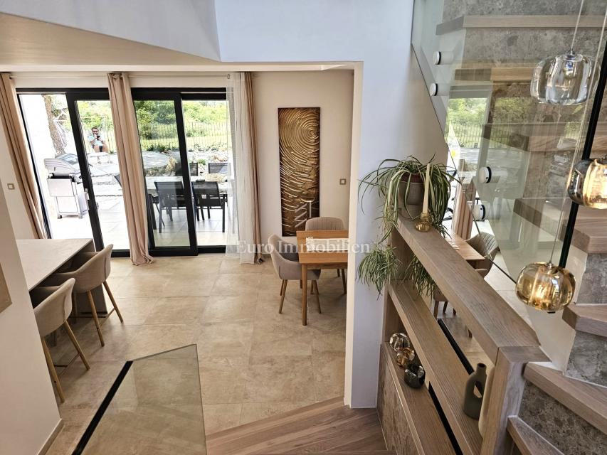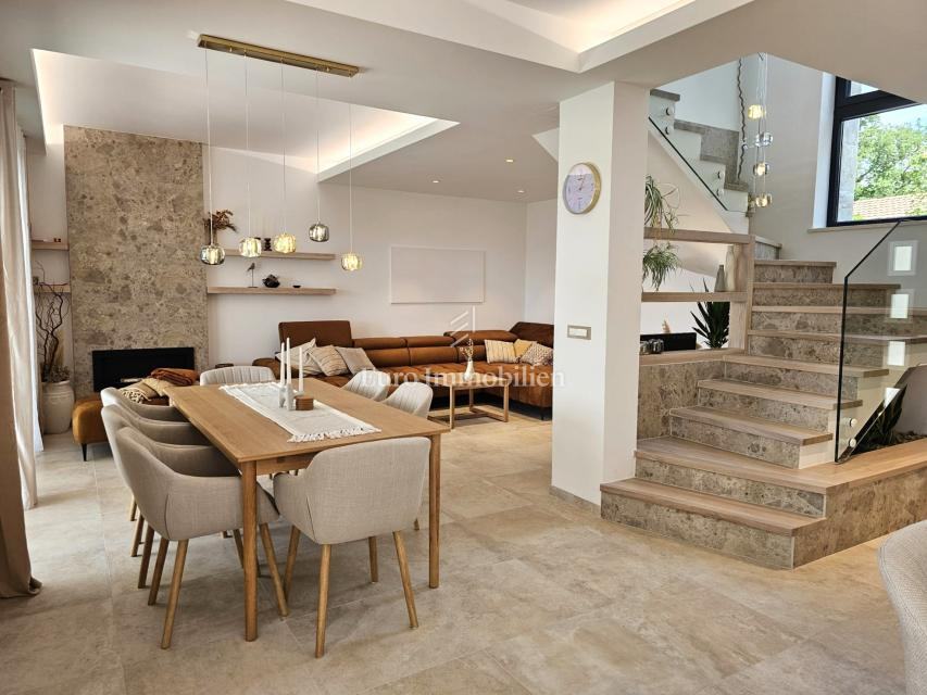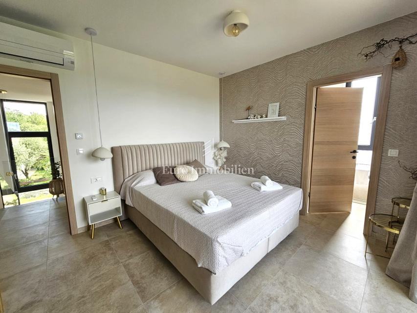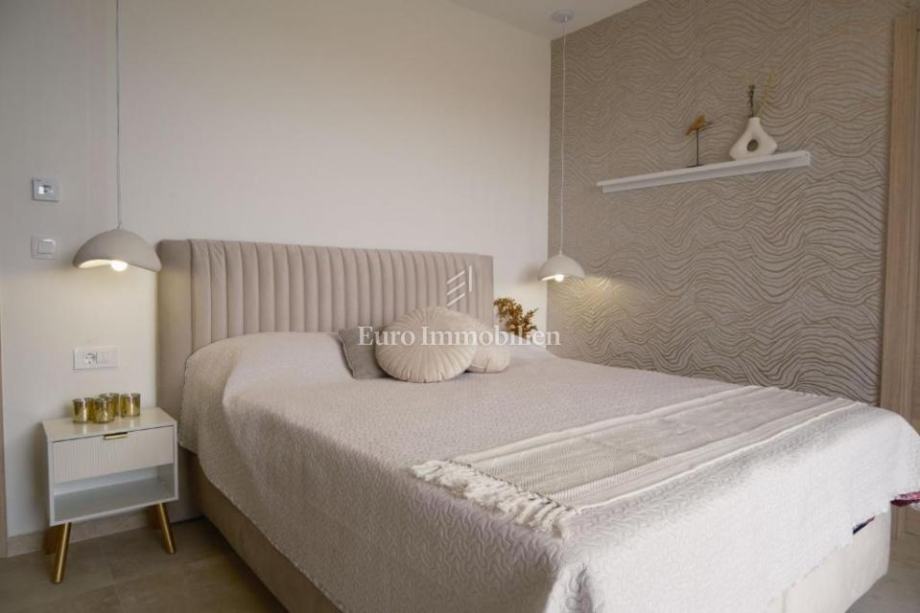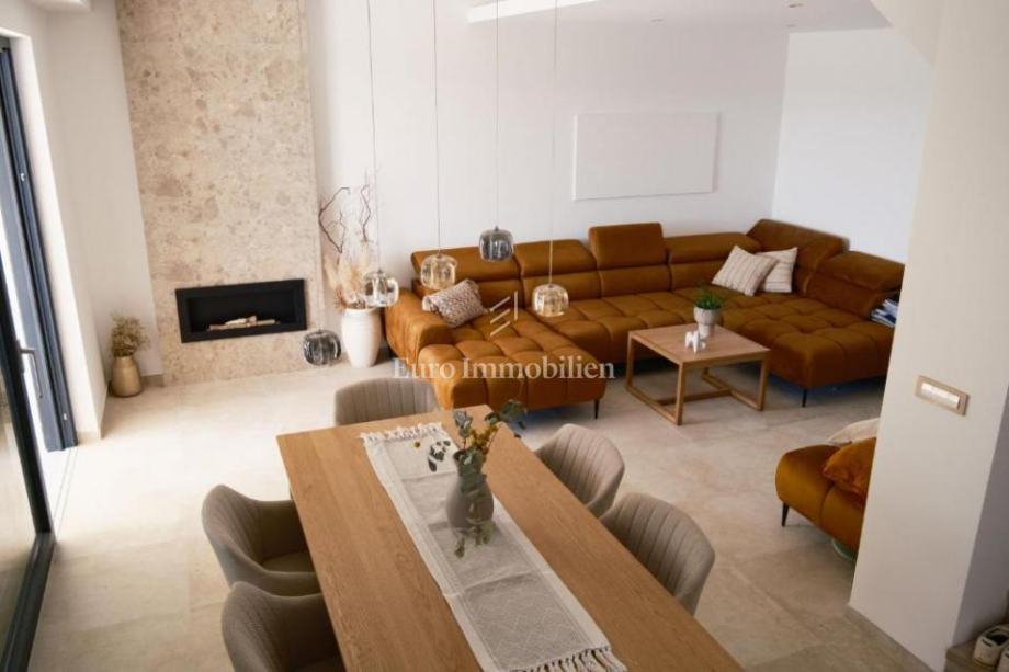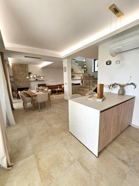 U prizemlju se nalaze ulazni prostor, toalet, kotlovnica, kuhinja s blagovaonicom te prostrani dnevni boravak s izlazom na natkrivenu terasu. Na katu su četiri prostrane spavaće sobe, svaka s vlastitom kupaonicom. Vila je građena kvalitetnim materijalima te opremljena keramičkim podovima, multisplit klimatizacijom, podnim grijanjem, PVC stolarijom visoke kvalitete, protuprovalnim vratima i modernim sanitarijama. Prodaje se potpuno namještena suvremenim namještajem.