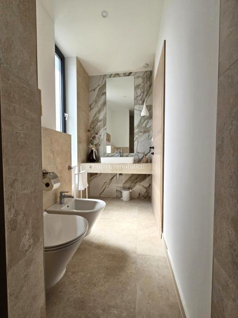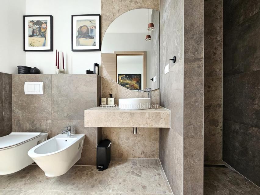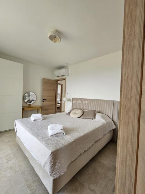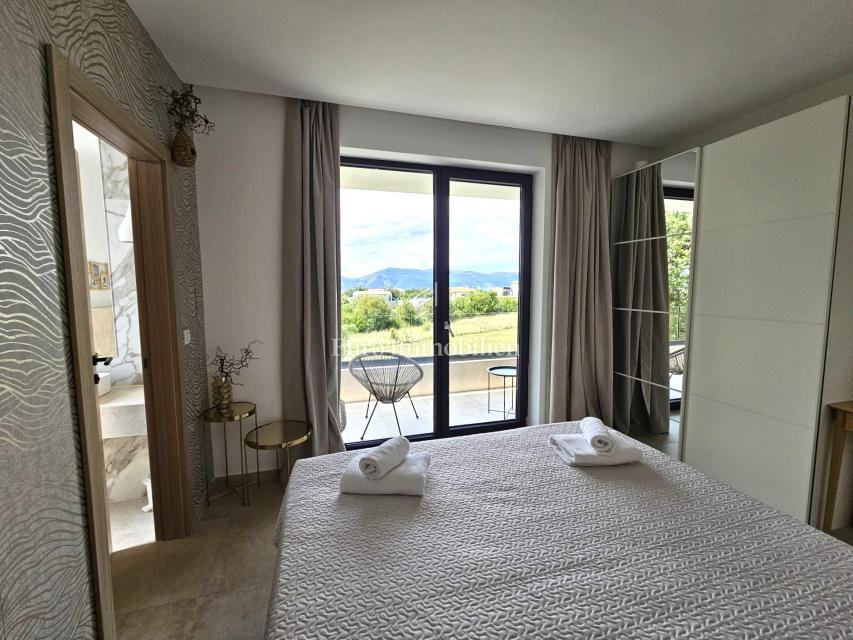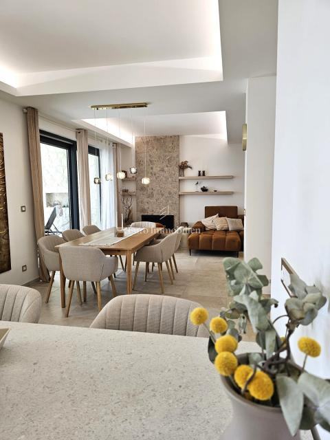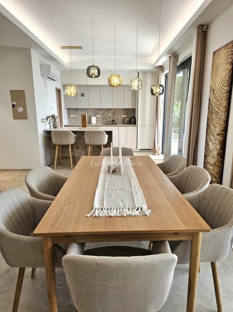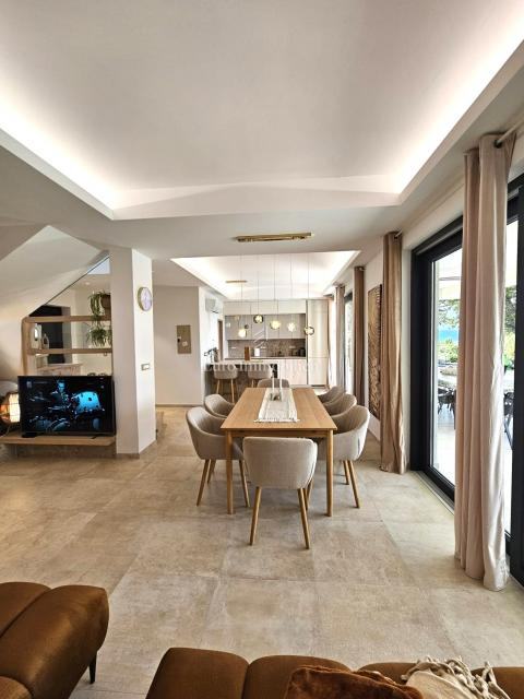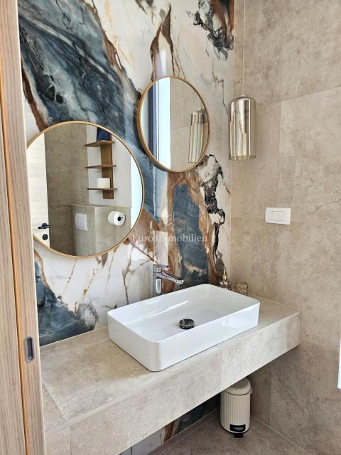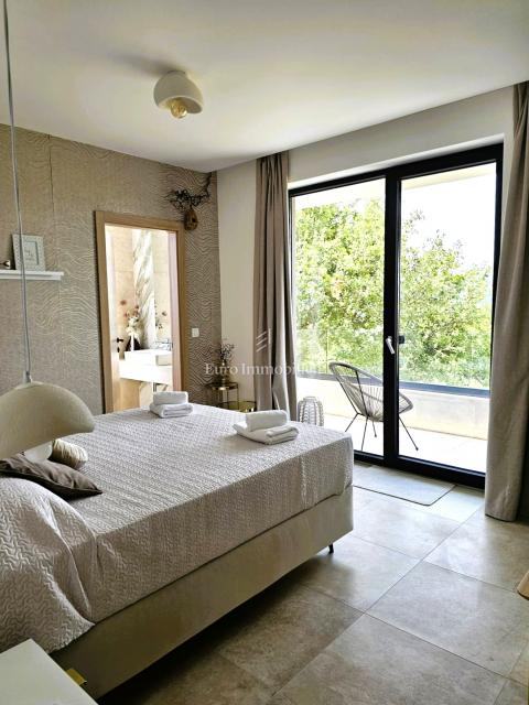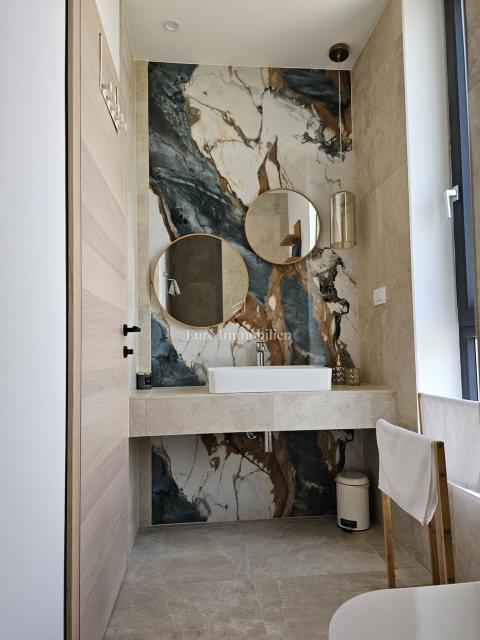 U prizemlju se nalaze ulazni prostor, toalet, kotlovnica, kuhinja s blagovaonicom te prostrani dnevni boravak s izlazom na natkrivenu terasu. Na katu su četiri prostrane spavaće sobe, svaka s vlastitom kupaonicom. Vila je građena kvalitetnim materijalima te opremljena keramičkim podovima, multisplit klimatizacijom, podnim grijanjem, PVC stolarijom visoke kvalitete, protuprovalnim vratima i modernim sanitarijama. Prodaje se potpuno namještena suvremenim namještajem.