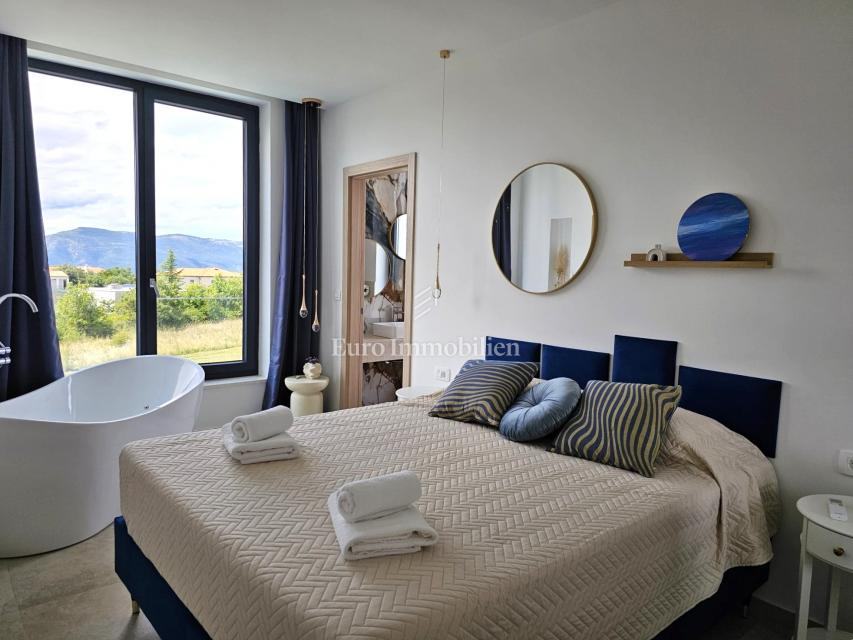 Na prodaju je moderna samostojeća vila na otoku Krku, smještena u mirnom okruženju u okolici Krka. Vila površine 170 m² nalazi se na uređenoj parceli te se prostire na dvije etaže povezane unutarnjim stubištem.