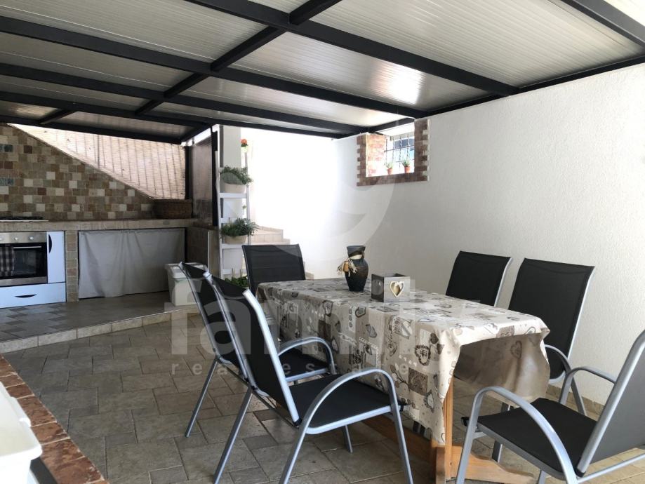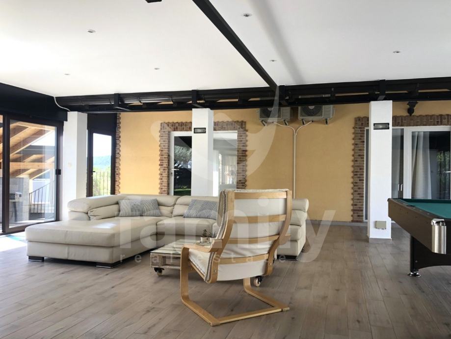 Prvu etažu nekretnine čini natkriveni dio za ručavanje, podovi i nogostupi kao i stepenice su obloženi kamenom. Centralni dio kuće od 100 m2 opremljen je velikom garniturom za sjedenje, televizorom i bilijardskim stolom. Sa lijeve i desne strane iz centralnog dijela se ulazi u apartmane na kat. Dva od četiri apartmana su renovirana i moderno opremljena sa novim uređajima za kuhinju sa indukcijskom pločom te se sastoje od dnevnog boravka, spavaćih soba kao i novim kupatilom. Cijeli objekat je opremljen sa jedinicama klima uređaja u svim prostorijama. Svaki apartman ima podove obložene visokokvalitetnim laminatom u dnevnom i spavaćem prostoru, kupatila su opremljena pločicama i izlazom na terase obložene kamenom koje pripadaju apartmanu. Vila je smještena na veoma ugodnoj i osvijetljenoj parceli što znači da su i njene prostorije dovoljno osvijeljene. Bogata je sadržajem i kompletno kvalitetnim dizajnom. Ispred nekretnine se nalaze tri natkrivena parking mjesta, a na stražnjoj strani dva parkinga koja su u samom dvorištu. Nekretnina je opremljena namještajem, video nadzorom, Wifi uređajima kao i priključkom kanalizacije.