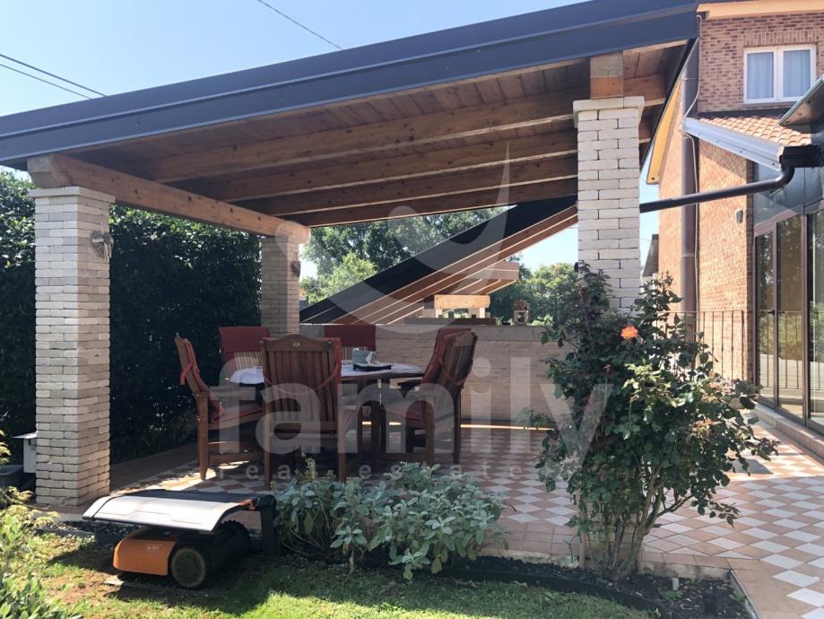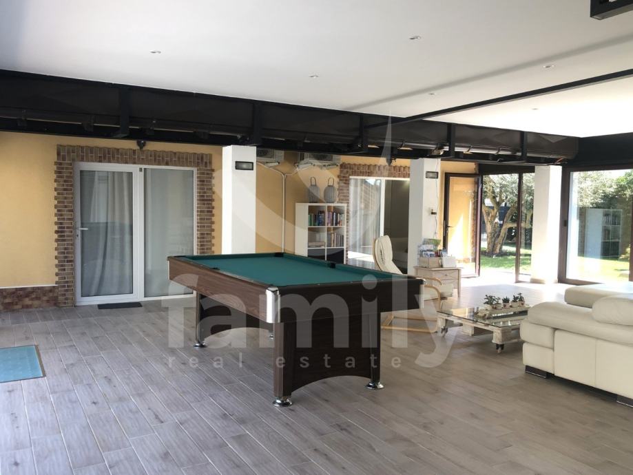 Upravo u Pomeru nedaleko od plaže se nalazi moderna visokokvalitetna vila površine 500 m2 i prekrasno uređenom okućnicom od 200 m2. Nekretnina se proteže na dvije etaže. U prizemlju se nalazi natkrivena konoba od 45 m2 sa prostranim prostorom za sjedenje, kvalitetno urađenim kaminom i opremljenom kuhinjom sa plinskom peći. Većinu materijala za uređenje konobe kao dvorišta je korišten kamen. Unutar prizemlja je smještena otvorena kuhinja sa svim kuhinjskim uređajima, velikim dnevnim boravkom u kojem se nalazi ručno rađeni kameni kamin kao i tri prostrane spavaće sobe i prostrano kupatilo sveukupne površine od 180 m2.