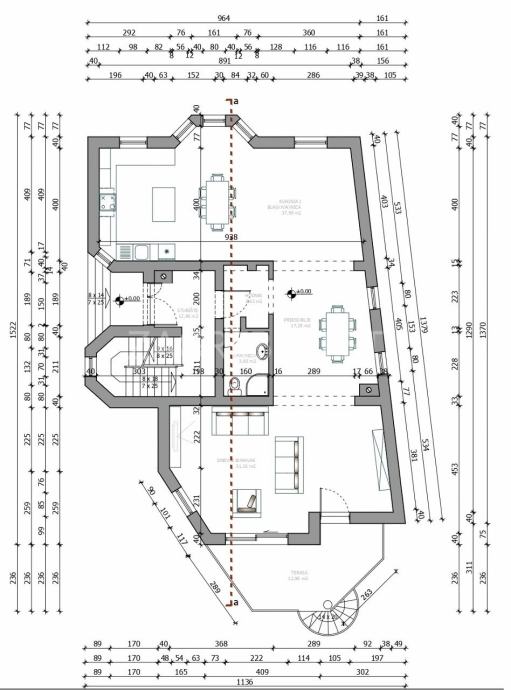 1. kat: velik dnevni boravak, iz kojega se izlazi na terasu, blagovaonica, prostrana kuhinja opremljena svim aparatima, kupaonica.