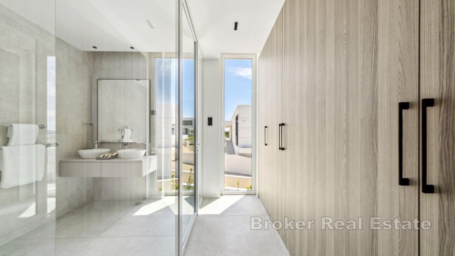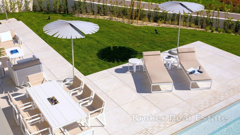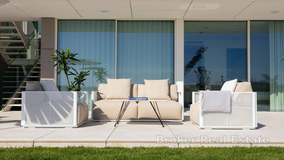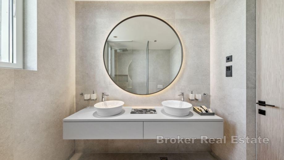 Veliki prozori od poda do stropa ispunjavaju interijer prirodnim svjetlom, besprijekorno spajajući modernu kuhinju i dnevni boravak sa zadivljujućom terasom u prizemlju. Savršeno za opuštanje i zabavu, dvorište vile uključuje privatni grijani bazen, bujni vrt, ljetnu kuhinju, dva prikladna vanjska parkirna mjesta.