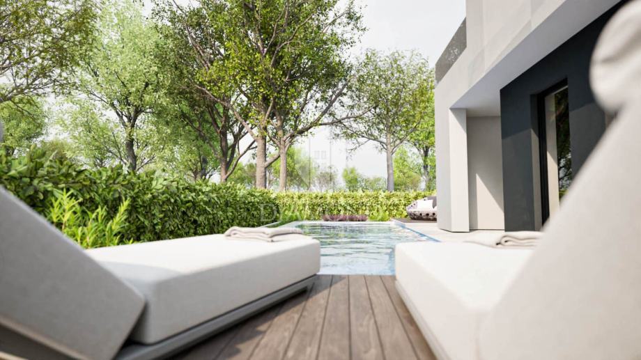 Prodaje se prostrana moderna vila u izgradnji, vila se nalazi 5 kilometara od Umaga u mirnoj lokaciji. Vila se sastoji prizemlja u kojem se nalazi veliki open space dnevni boravak sa blagovaonicom, kuhinja sa otokom, spremište, utility room i hodnik. Iz dnevnog boravka se pristupa na natkrivenu terasu koja je povezana sa sunčalištem i bazenom. Unutarnjim stepenicama dolazimo na prvi kat di se nalazi hodnik sa ulazima za 3 spavaće sobe sa vlastitim kupaonicama i izlazom na natkrivenu terasu. Vila će biti opremljena sa video nadzorom, alarmom i roletama na struju. Vila ima dosta staklenih otvora kroz je će dobivati puno dnevne svjetlosti.