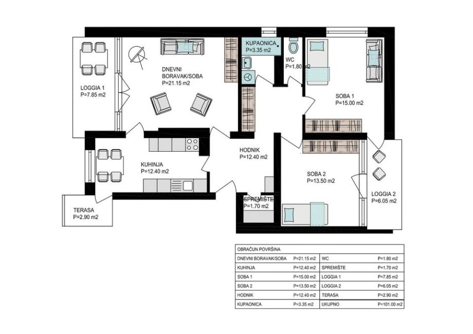 Stan je potpuno opremljen, svaka soba ima zasebnu klimu. Stan ima 3 terase. Parking se nalazi u dvorištu zgrade.