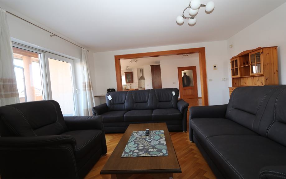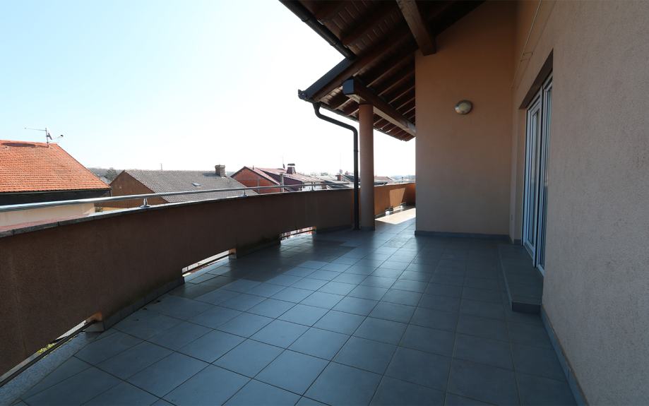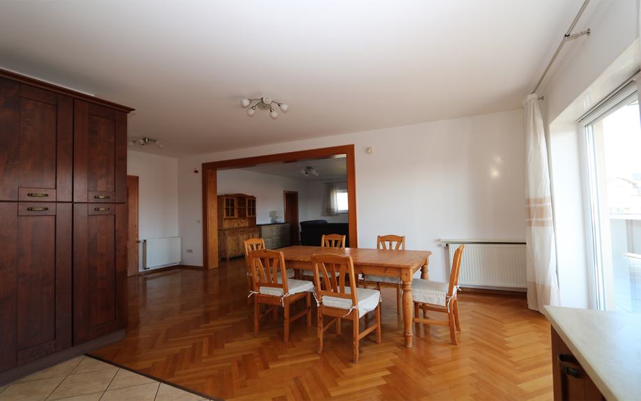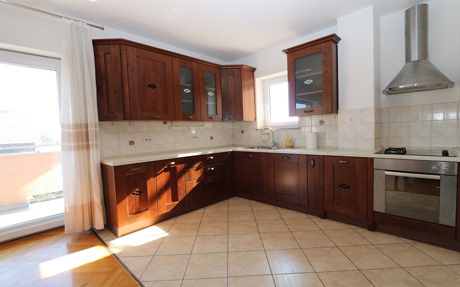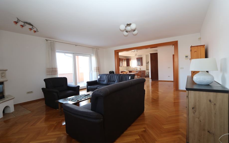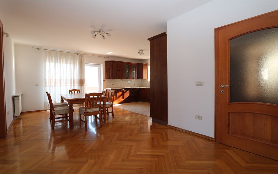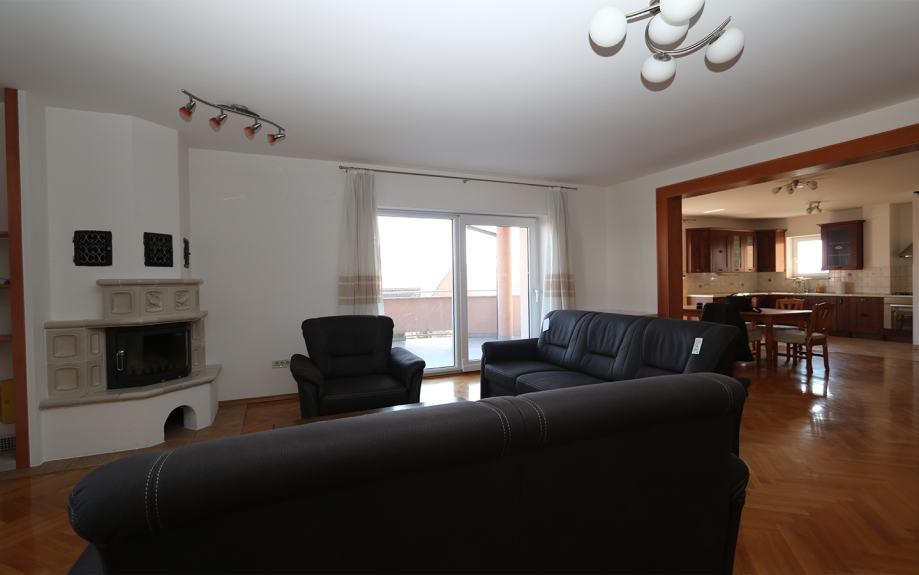 prostranog dnevnog boravka i kuhinje koja izlazi na veliku terasu (32 m²) savršenu za opuštanje ili obiteljska druženja. Stan ima odličan raspored prostorija.