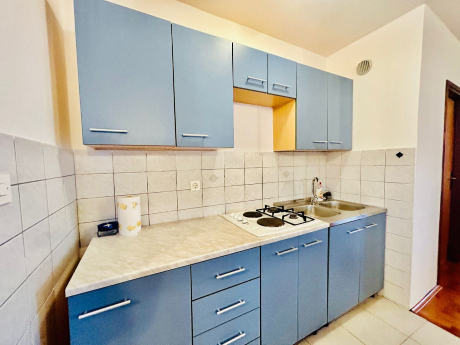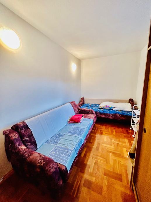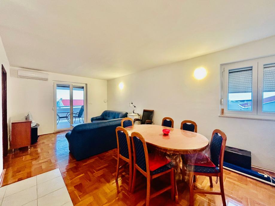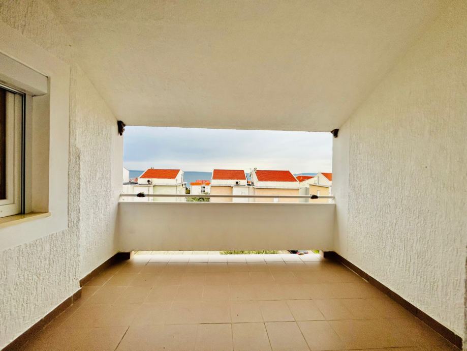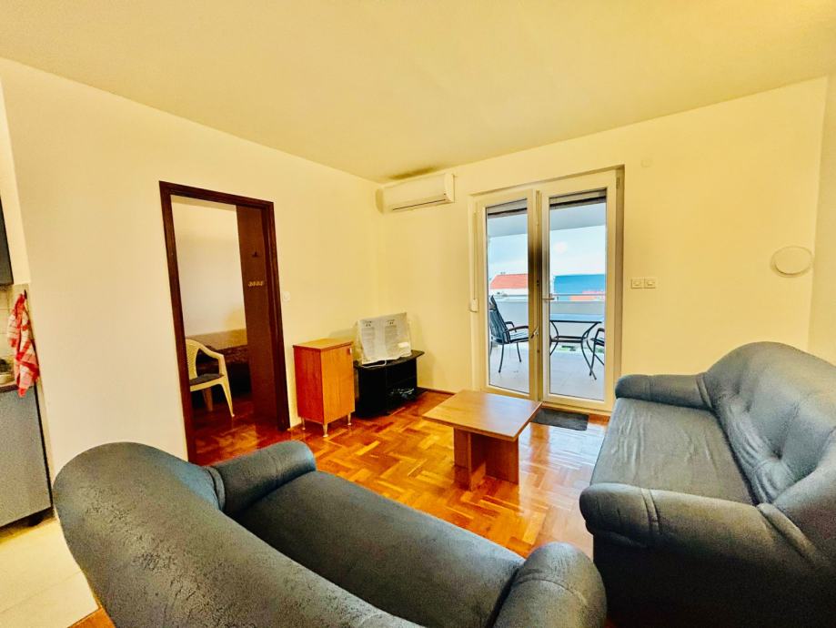 Apartman je smješten na 2. katu zgrade, a lociran je tako da se iz njega pruža pogled na more, a udaljenost od plaže je cca 200 m. Stambeni prostor sastoji se od prostranog hodnika, kupaonice, dvije spavaće sobe, kuhinje, blagovaonice i dnevnog boravka iz kojeg se izlazi na veliku lođu sa pogledom na more.
