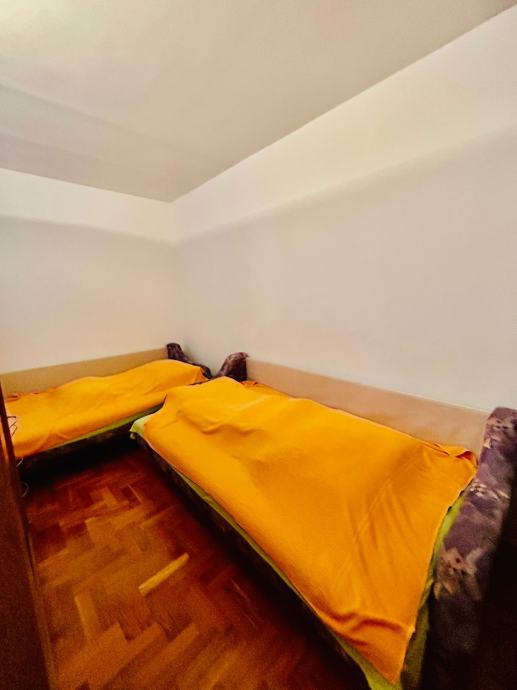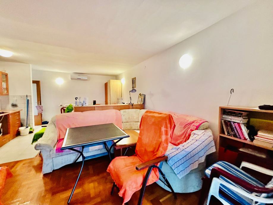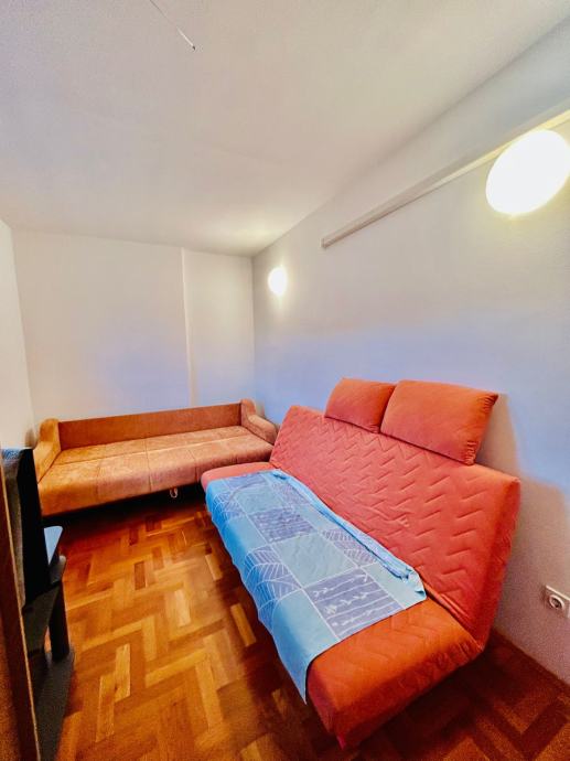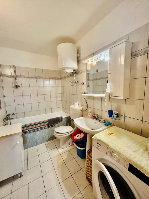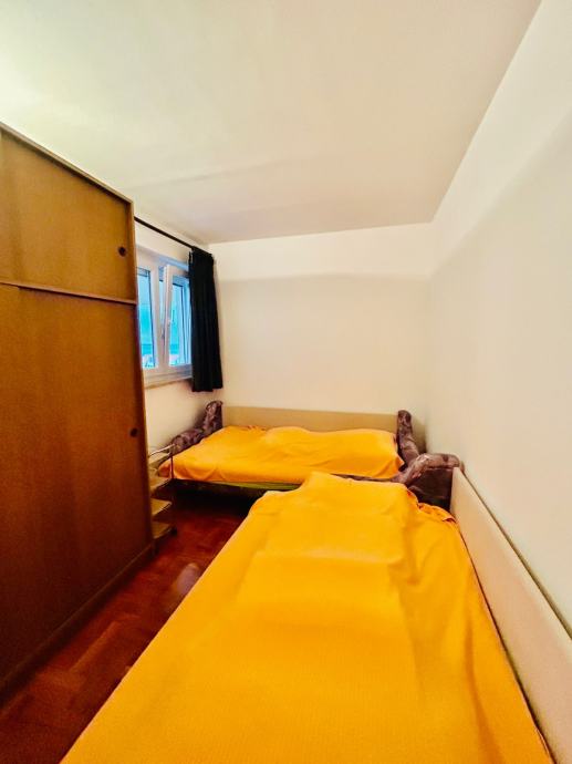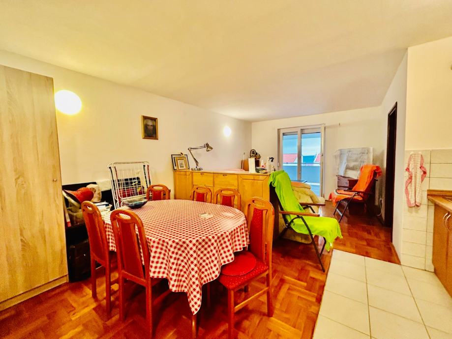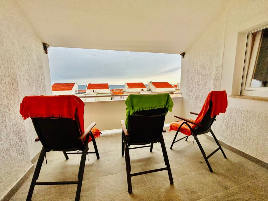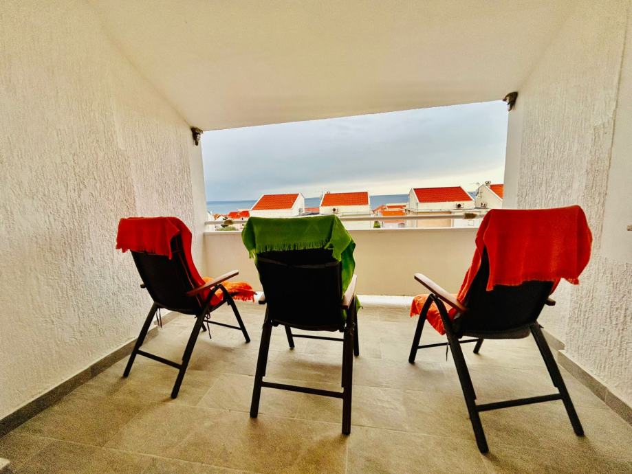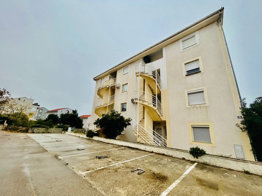 Apartman je smješten na 2. katu zgrade, a lociran je tako da se iz njega pruža pogled na more, a udaljenost od plaže je cca 200 m. Stambeni prostor sastoji se od prostranog hodnika, kupaonice, dvije spavaće sobe, kuhinje, blagovaonice i dnevnog boravka iz kojeg se izlazi na veliku lođu sa pogledom na more.