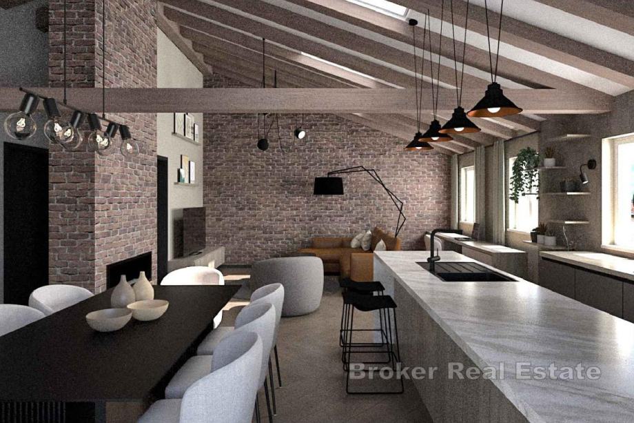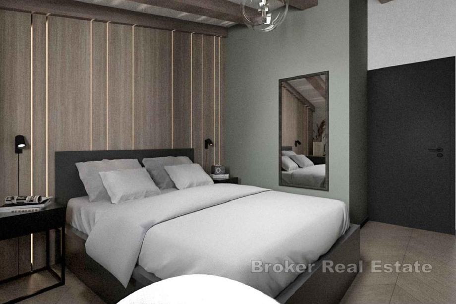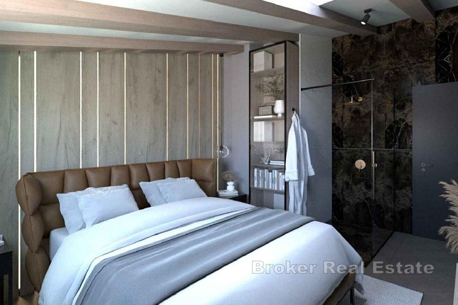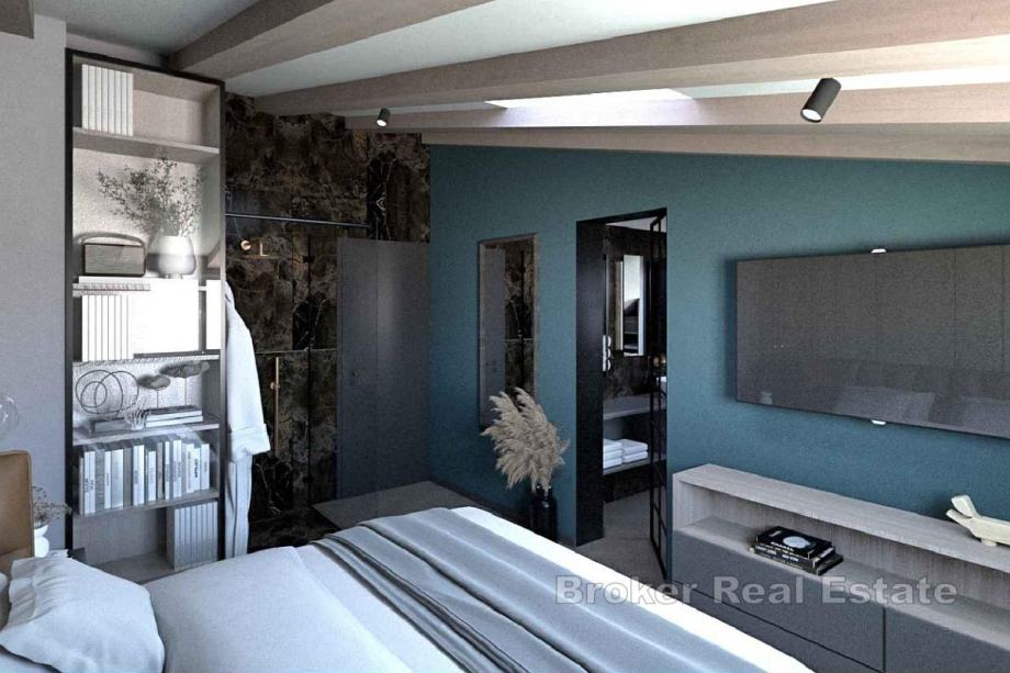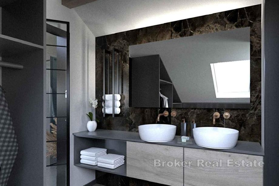 Ukupne površine od 100 m², stan predstavlja idealan potencijal za uređenje po mjeri budućeg vlasnika. Već postoji izrađen arhitektonski nacrt s više prijedloga rasporeda, pri čemu je predviđena moderna organizacija prostora: ulazni hodnik vodi u otvoreni dnevni boravak povezan s kuhinjom i blagovaonicom, s izlazom na prostrani balkon površine 8,68 m². Planirani raspored uključuje i dvije kupaonice, dvije udobne spavaće sobe (od kojih glavna ima vlastiti walk-in ormar) te funkcionalnu praonicu.