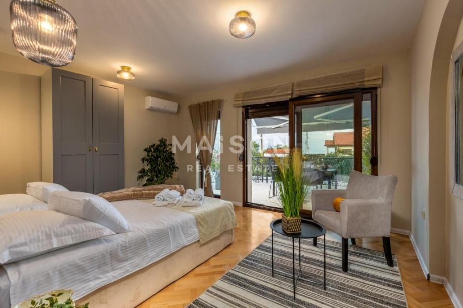 Stan je omiljen među gostima jer se nalazi u prizemlju te omogućuje izravan izlaz na bazen s terase, što ga čini idealnim za obitelji s djecom ili sve koji žele boraviti uz bazen tijekom cijelog dana. Apartman je opremljen kuhinjom koja uključuje pećnicu, kuhalo za vodu, toster, aparat za kavu, hladnjak i perilicu posuđa. Na zahtjev su dostupni dječji krevetić i hranilica.