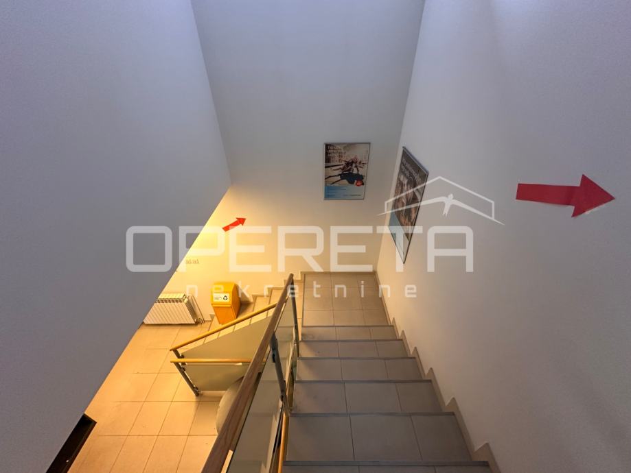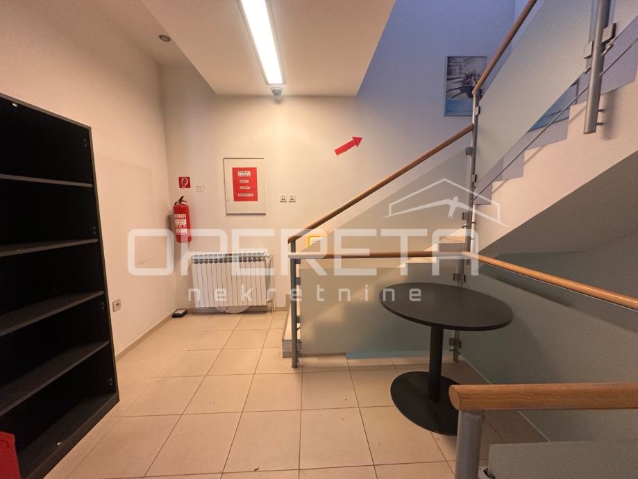 Prostor je organiziran na tri etaže – podrum, prizemlje i prvi kat – i nudi funkcionalnost te fleksibilnost u rasporedu. U prizemlju se nalazi reprezentativni ulazni dio, idealan za prijem klijenata, dok je prvi kat prilagođen uredskom rasporedu ili podjeli na manje jedinice. Podrum je praktičan za arhivu, tehničke sadržaje ili podršku poslovanju, a povezan je internim teretnim liftom koji olakšava transport između etaža.
