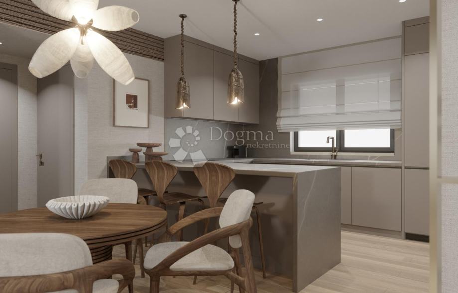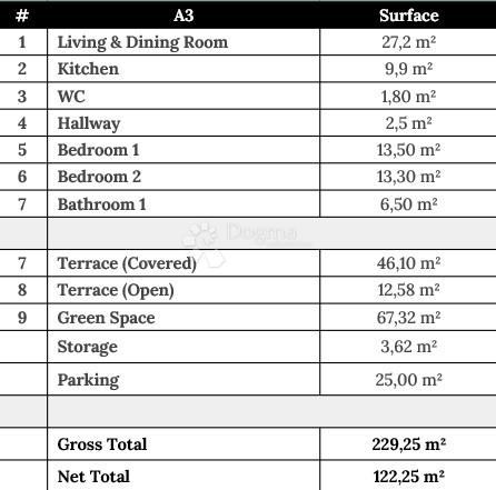 Stan A3, s neto površinom od 122,25 m², savršen je primjer tog koncepta. Unutrašnjost nudi dvije spavaće sobe, kupaonicu i dodatni WC, moderno dizajniranu kuhinju i blagovaonicu povezanu s prostranim dnevnim boravkom. Ono što ovaj stan čini posebnim jesu vanjski prostori: natkrivena terasa od impresivnih 46 m², dodatna otvorena terasa od 12,58 m² i privatni vrt od 67 m² – idealno za ljetna druženja, obiteljske objede ili jednostavno mirna poslijepodneva u hladu.