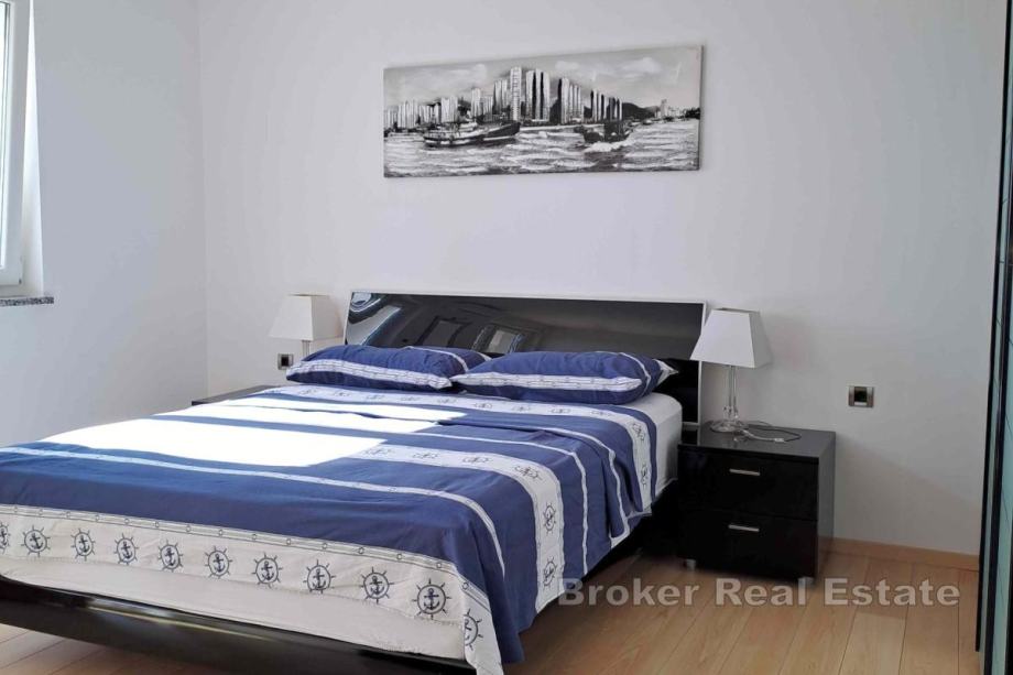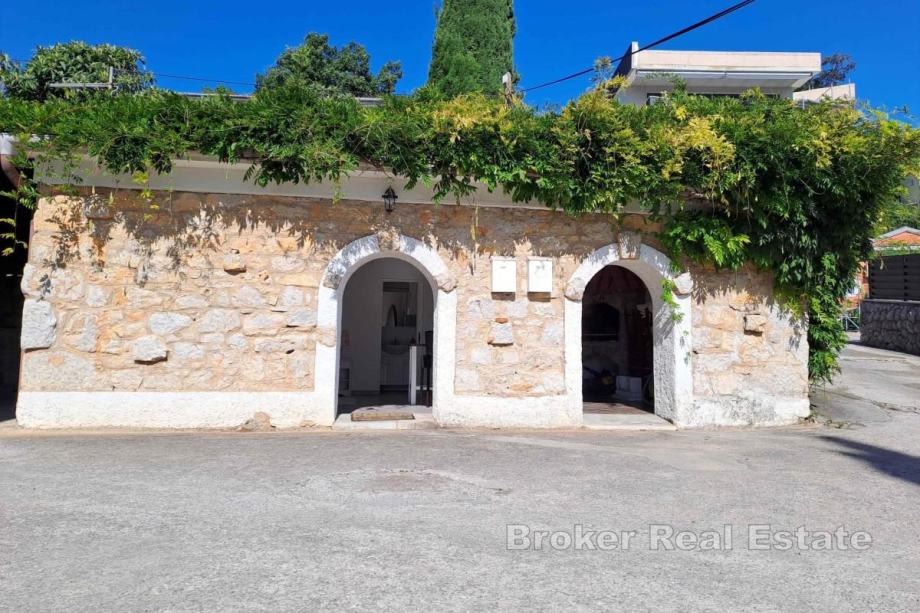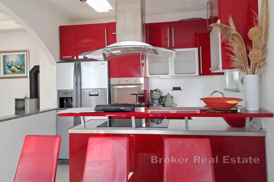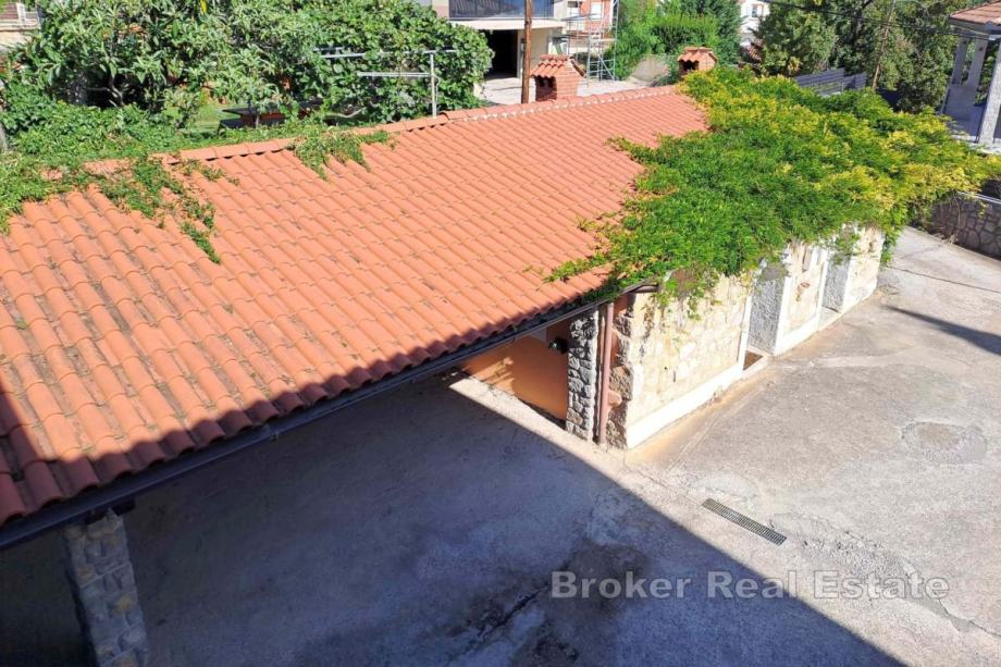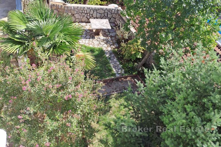 Dodatno mu pripada dio okućnice od 80 m² te dva natkrivena parkirna mjesta.Iza vile uređeno je zajedničko mjesto za druženja s kaminom i roštiljem, što ovu nekretninu čini još praktičnijom i privlačnijom. Stan i konoba su klimatizirani, a grijanje se može prilagoditi potrebama, od električnih radijatora do kamina na kruta goriva.