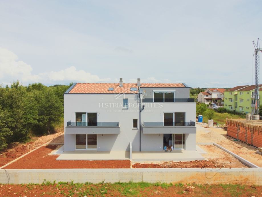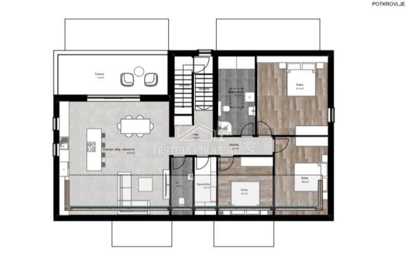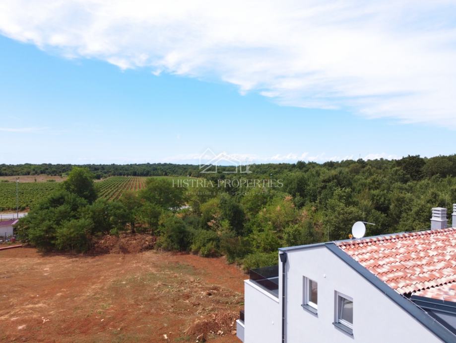 Stan se sastoji od ulaznog hodnika, open space dnevnog boravka sa kuhinjom i blagovaonom iz kojih se izlazi na osunčanu terasu sa pogledom prema Poreču. U stanu se nalaze još 3 spavaće sobe, kupaonica, zasebni toalet i spremište/praonica.