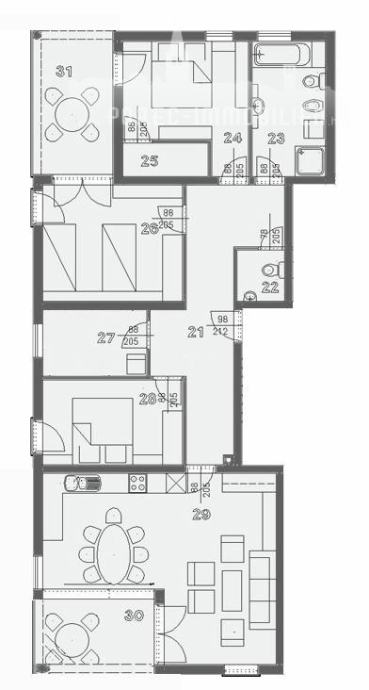 Stan je funkcionalnog rasporeda i sastoji se od hodnika, koji povezuje sve prostorije - tri spavaće sobe, od kojih dvije imaju izlaz na terasu, kuhinja, dnevni boravak sa blagovaonicom koji su napravljeni u otvorenom stilu, što prostoru daje dodatnu prostranost i svjetlost, zatim radna soba, koja može poslužiti i kao dodatna spavaća soba, kupaonica i gostinjski WC.