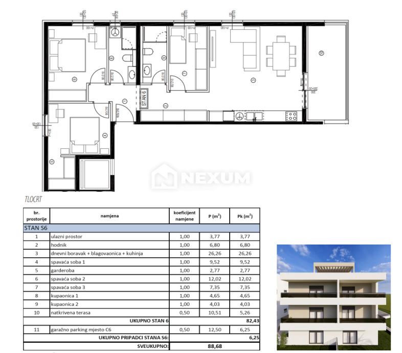 Na prodaju je prostran i funkcionalan trosobni stan s dvije kupaonice, garderobom i natkrivenom terasom, savršen za obiteljski život ili dugoročno ulaganje.