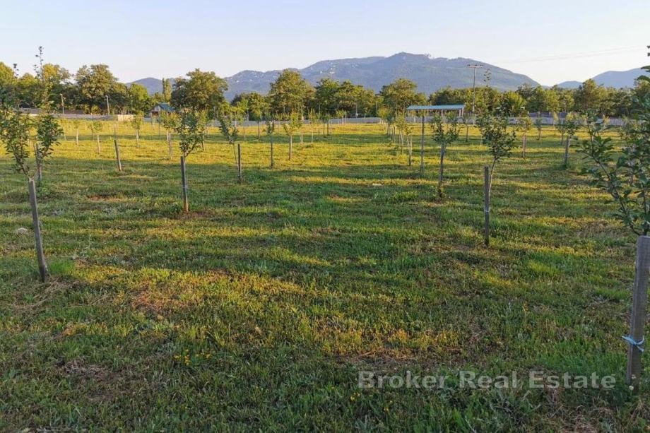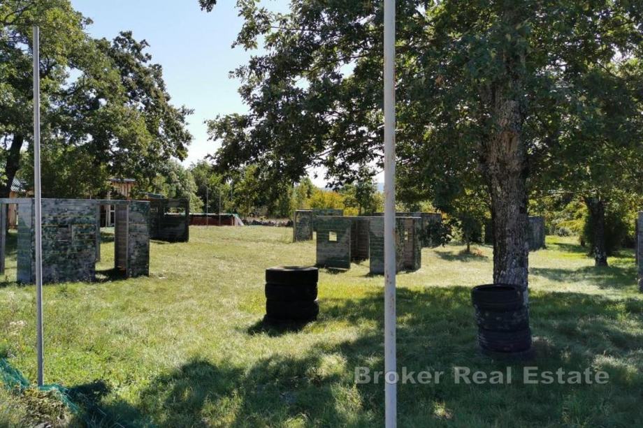 Prostrana livada na imanju pretvorena je u sportsko igralište s nogometnim golovima i terenom za badminton, dok su dječji park i trampolin osmišljeni za najmlađe članove obitelji. Infrastruktura je potpuno riješena – imanje ima struju i gradski vodovod, a dodatnu sigurnost pruža vlastita bušotina dubine 130 metara te septička bio-jama.