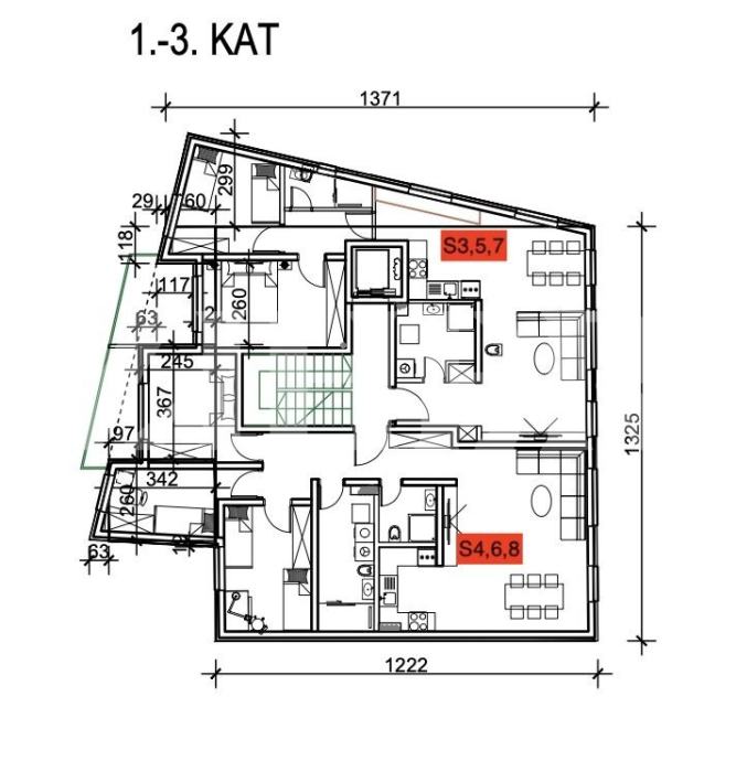 S8 - Dnevni boravak, kuhinja i blagavaonica, dvije kupaonice, tri spavaće sobe ukupne površine 84 m2 + balkon 5 m2 + 2 garažno PM = 1.900 eura/mjesečno