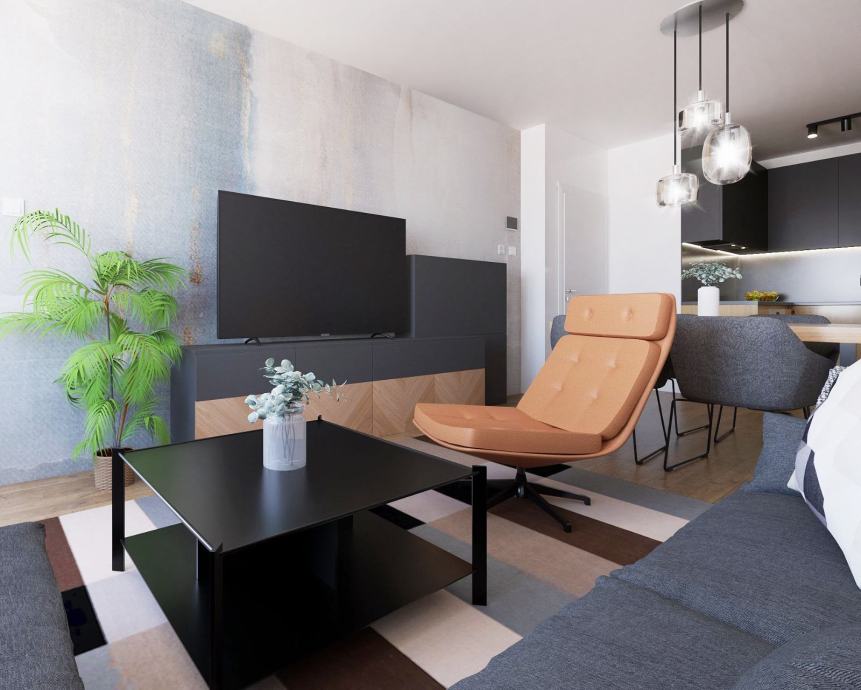 Stan je uređen s posebnom pažnjom – namještaj rađen po mjeri, kvalitetni kućanski aparati te moderan, ugodan interijer učinit će da se osjećate kao kod kuće već od prvog dana.