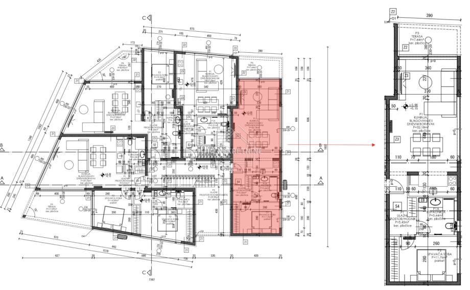 Brutto površina stana i pripadaka iznosi 117,53 m² dok je netto prodajna površina: 64,80 m².