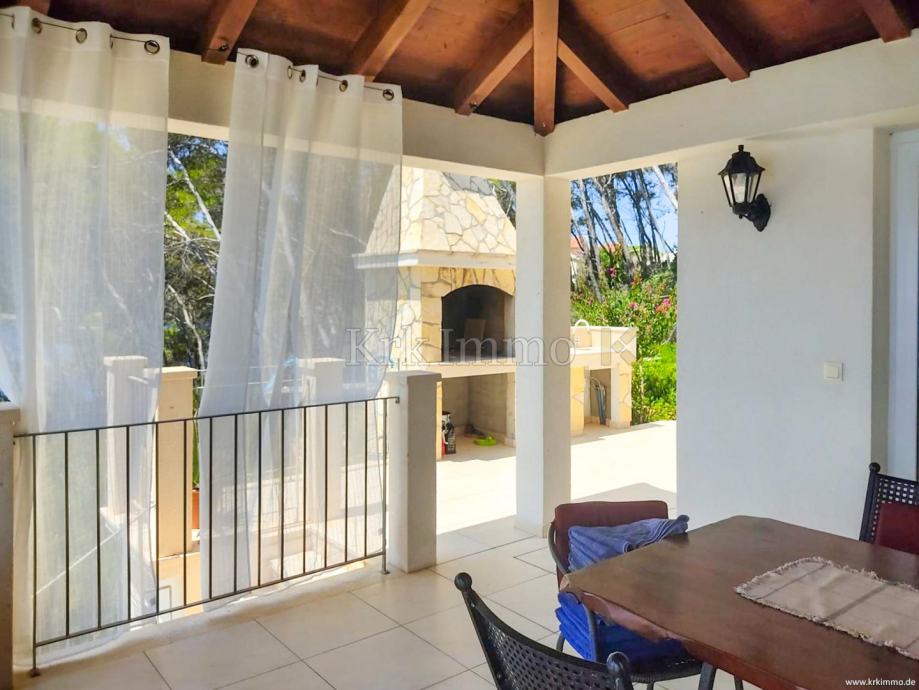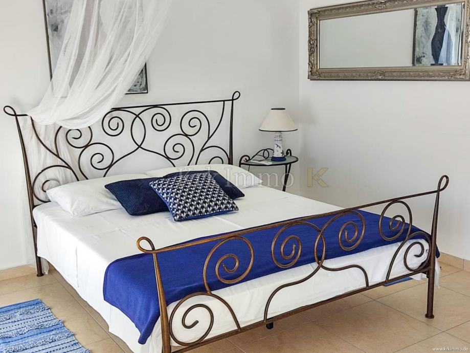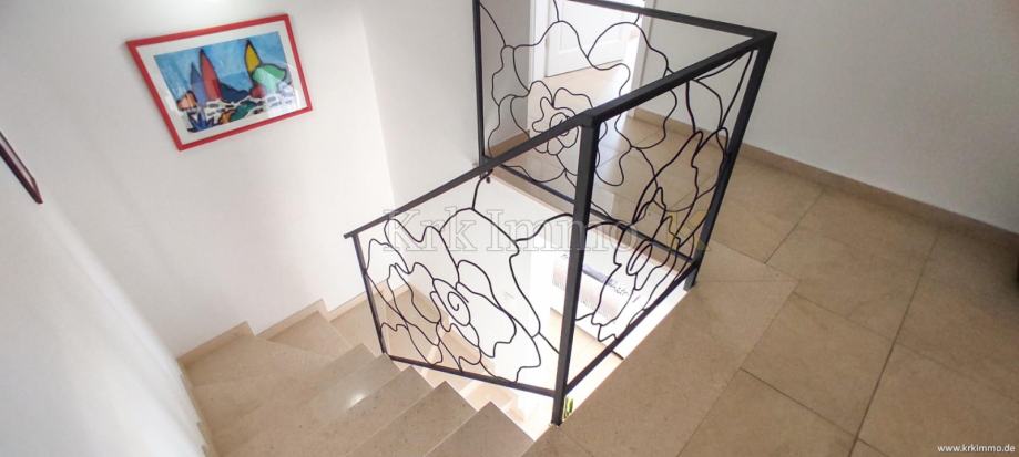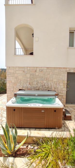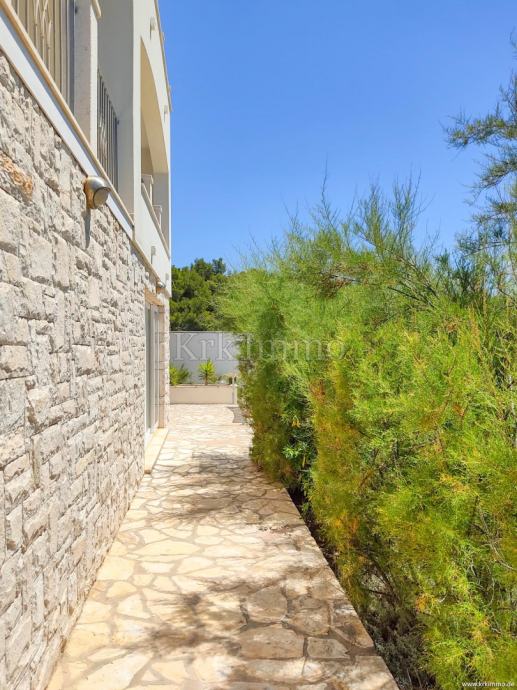 Prizemlje sadrži kupaonicu, jednu spavaću sobu, kuhinju, blagovaonicu i dnevni boravak s izlazom na terasu gdje se nalazi vanjski kamin i prostor za okupljanje. Unutarnje stubište vodi na prvi kat, gdje se nalaze tri spavaće sobe, od kojih jedna ima vlastitu kupaonicu i veliki balkon, dok dvije sobe dijele kupaonicu s kadom. Sa svih terasa pruža se prekrasan panoramski pogled na more.