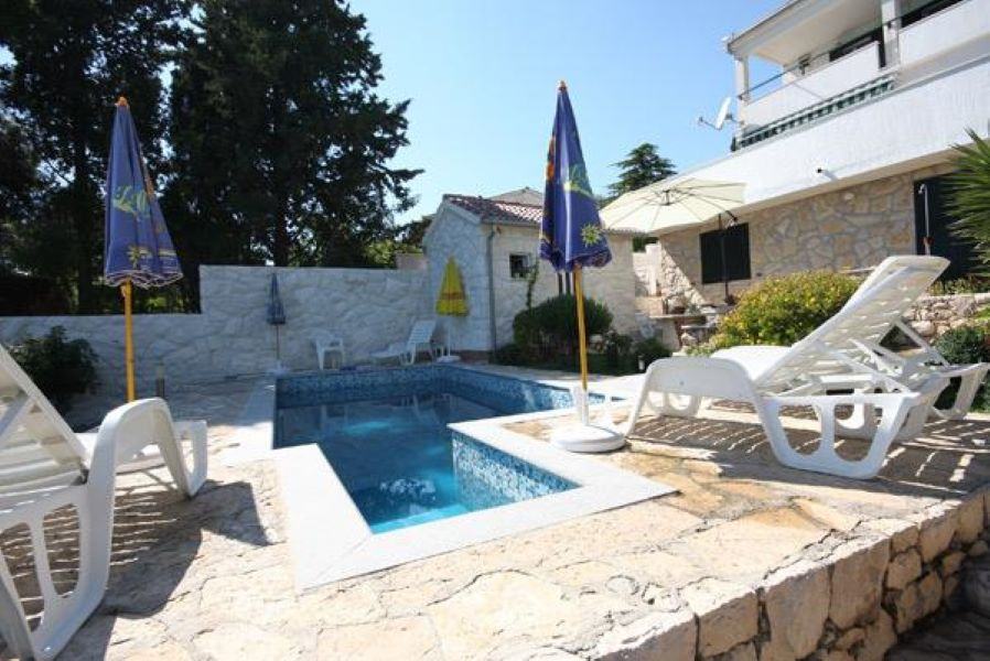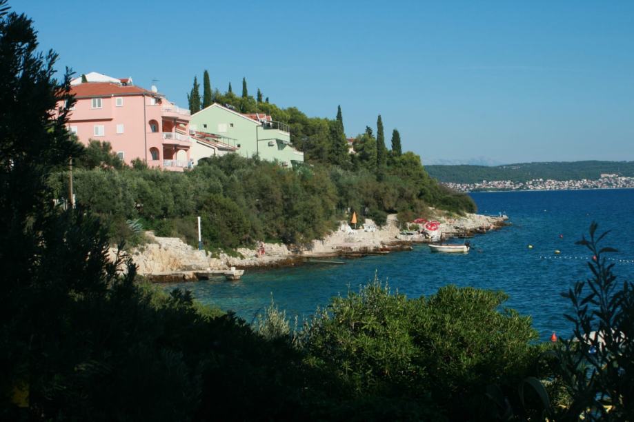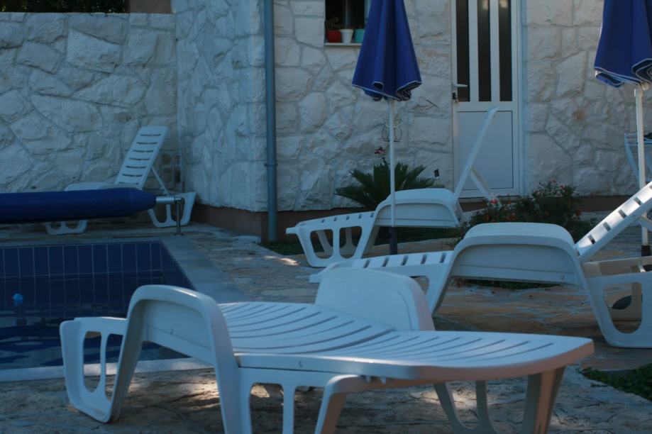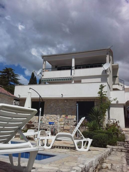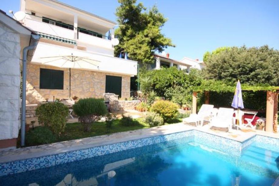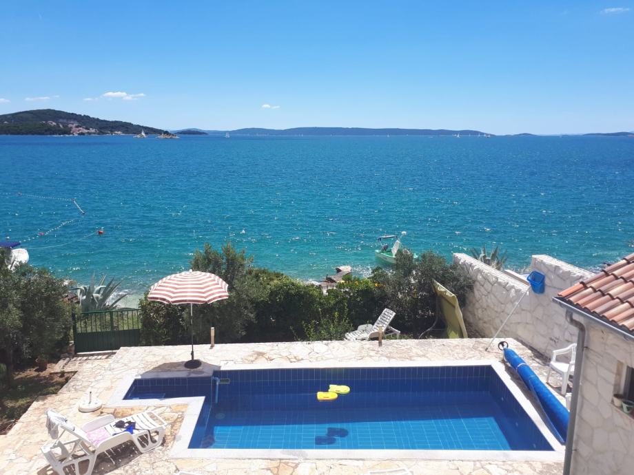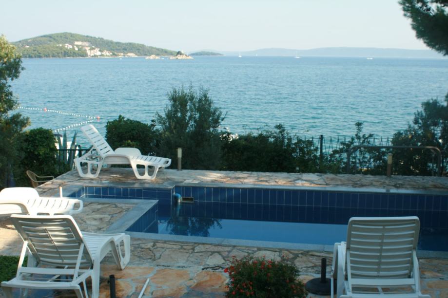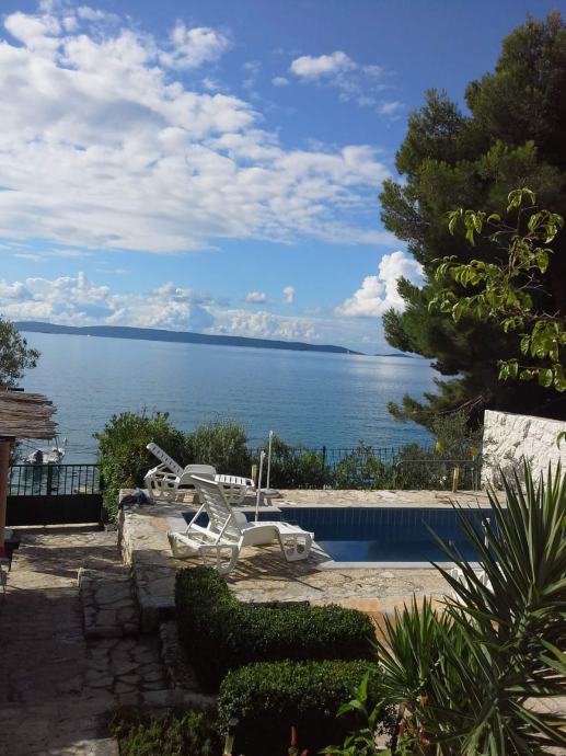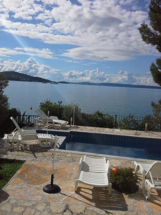 EKSKLUZIVNO zastupamo, prodaju kuće s bazenom samo 14 m od mora, na parceli od 460 m2. Kuća je na tri etaže, a sadrži pet apartmana( 3 velika i dva manja), vrtna kučica, roštilj, četiri parkirna mjesta, vez za brod. Asfaltni prilaz do kuće. Vlasništvo uredno.