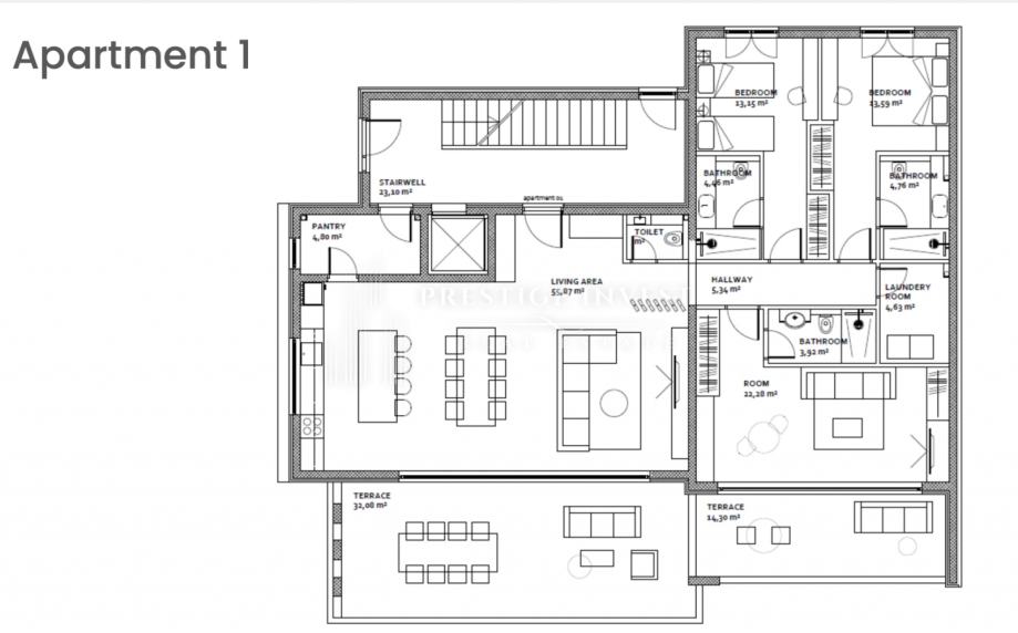 Natkrivene terase: 32,08 m² + 14,30 m² (obračunski 32,08 m² + 10,73 m²)