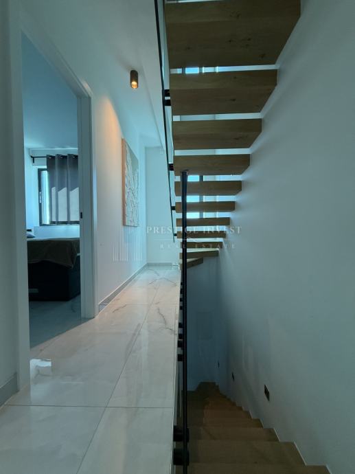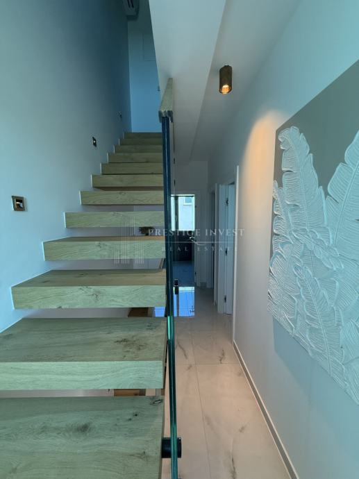 Višeetažni stan se sastoji od ulaza, kupaonice, kuhinje, blagovaone i dnevnog boravka u prizemlju iz kojeg se izlazi na vanjsku terasu.