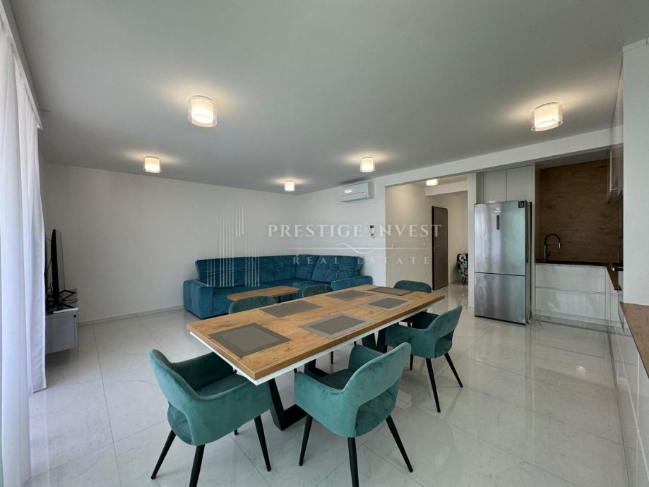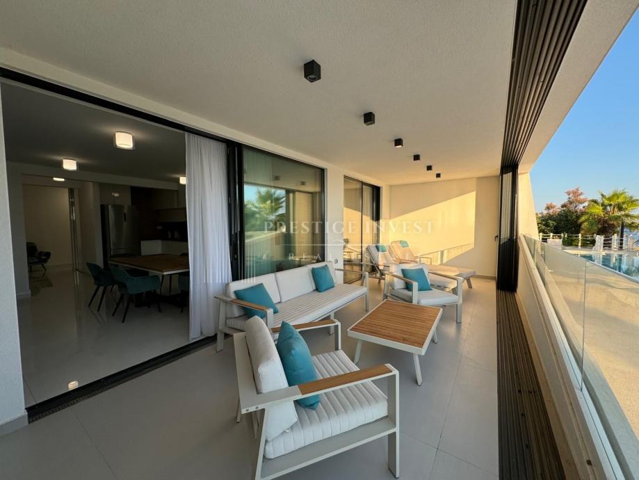 Na prodaju je luksuzan trosoban stan smješten u prizemlju moderne zgrade opremljena s liftom, bazenima i podzemnom garažom prvi red uz more.