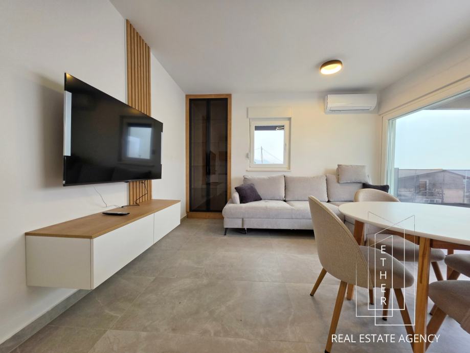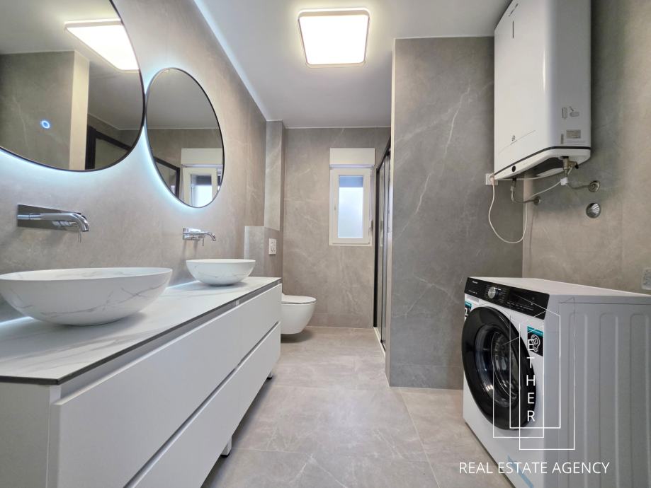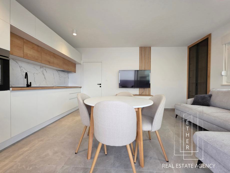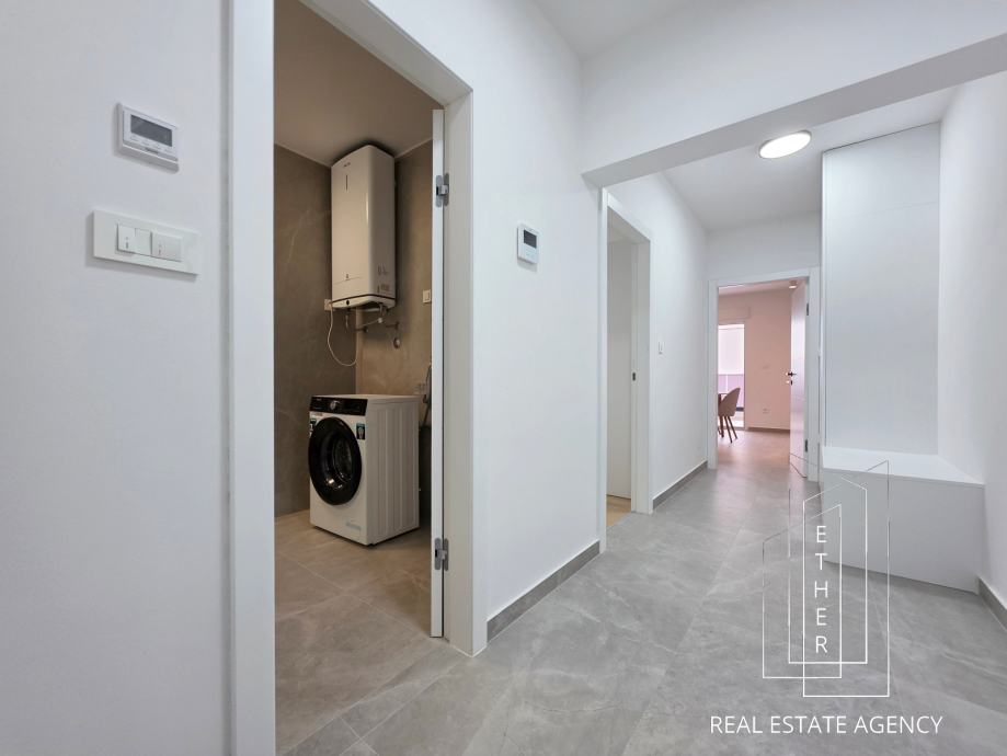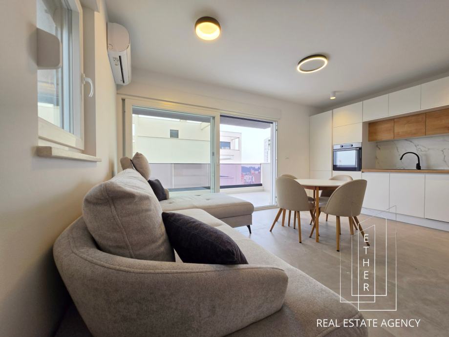 Stan je moderno opremljen i uređen suvremenim namještajem i kvalitetnim materijalima. U kupaonici je ugrađeno podno grijanje koje osigurava dodatnu razinu komfora. Stan je klimatiziran s dva klima uređaja – jedan je smješten u spavaćoj sobi, a drugi u kuhinji s blagovaonicom i dnevnim dijelom, što omogućuje optimalnu temperaturu tijekom cijele godine.