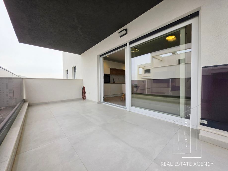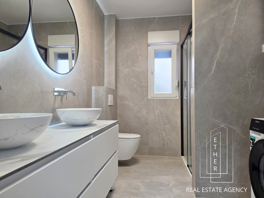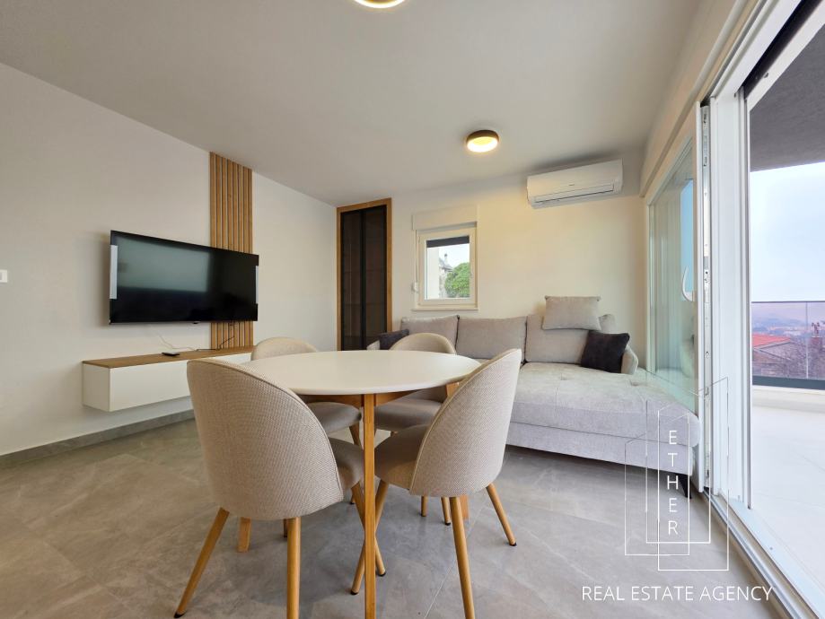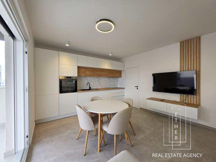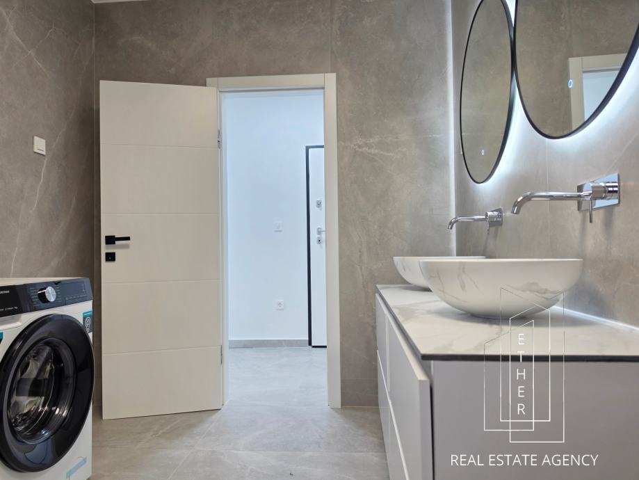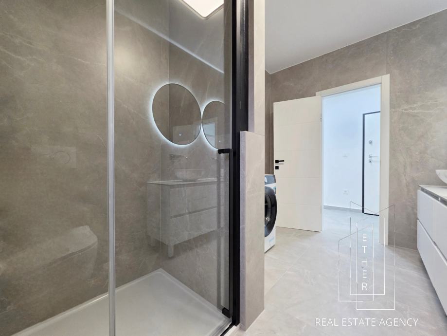 Stan je moderno opremljen i uređen suvremenim namještajem i kvalitetnim materijalima. U kupaonici je ugrađeno podno grijanje koje osigurava dodatnu razinu komfora. Stan je klimatiziran s dva klima uređaja – jedan je smješten u spavaćoj sobi, a drugi u kuhinji s blagovaonicom i dnevnim dijelom, što omogućuje optimalnu temperaturu tijekom cijele godine.