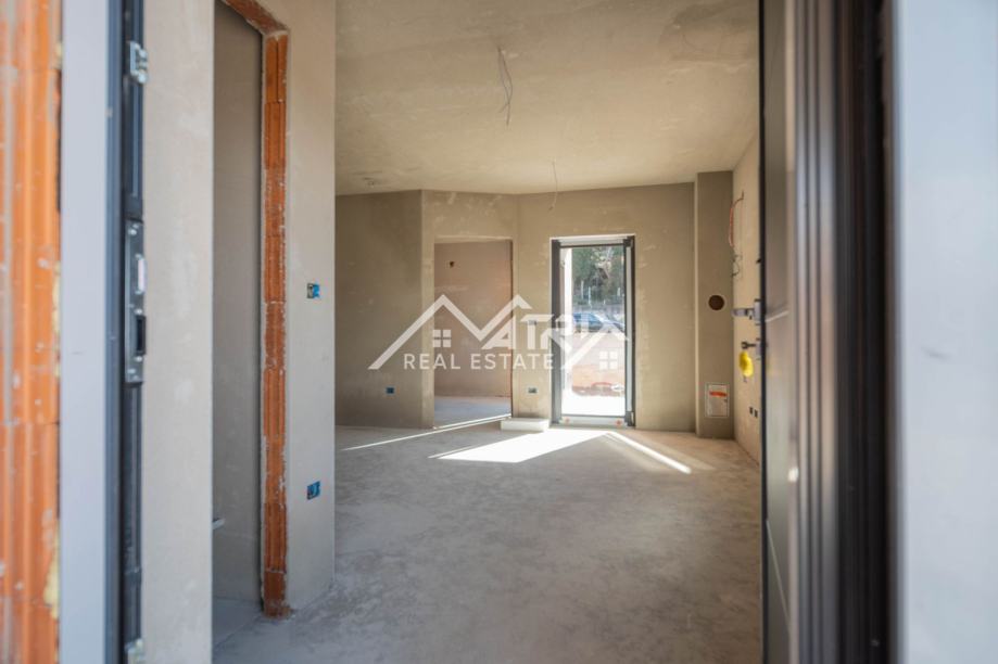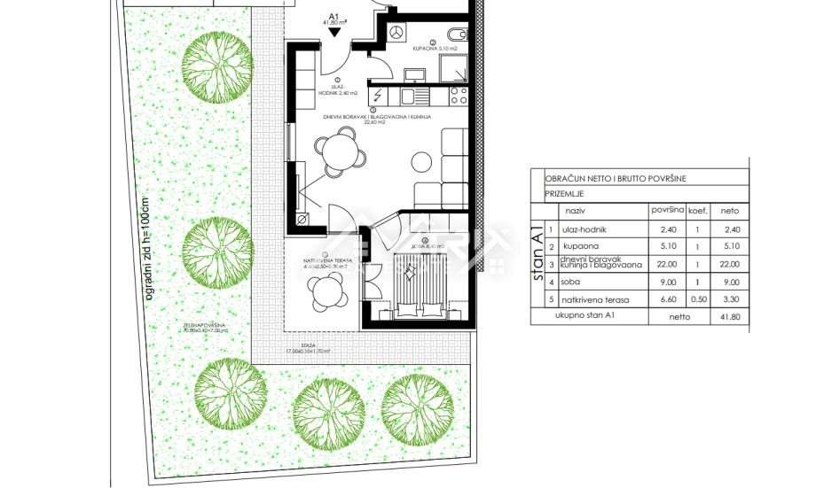 Stan ima 41,80 m² neto stambene površine, a dodatnu vrijednost čine privatni vrt od 87 m² i jedno parkirno mjesto. Ukupna obračunska površina iznosi 54,37 m². Unutrašnjost je organizirana praktično: ulazni hodnik, kupaonica, zatim otvoreni dnevni prostor s kuhinjom i blagovaonicom te dnevnim boravkom, uz jednu spavaću sobu. Dnevni dio se nastavlja na natkrivenu terasu i vrt, što daje ugodan “prizemni” stil života – jutarnju kavu vani, roštilj s prijateljima ili siguran prostor za djecu i kućne ljubimce.
