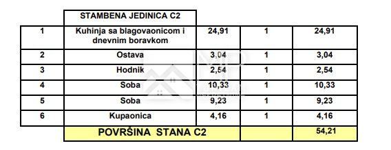 Predmetni stan oznake "C2" nalazi se na II. katu zgrade ( 54,21 m2 ), a sastoji se od kuhinje s blagovaonicom i dnevnim boravkom, lođe, hodnika, dvije spavaće sobe, ostave i kupaonice.