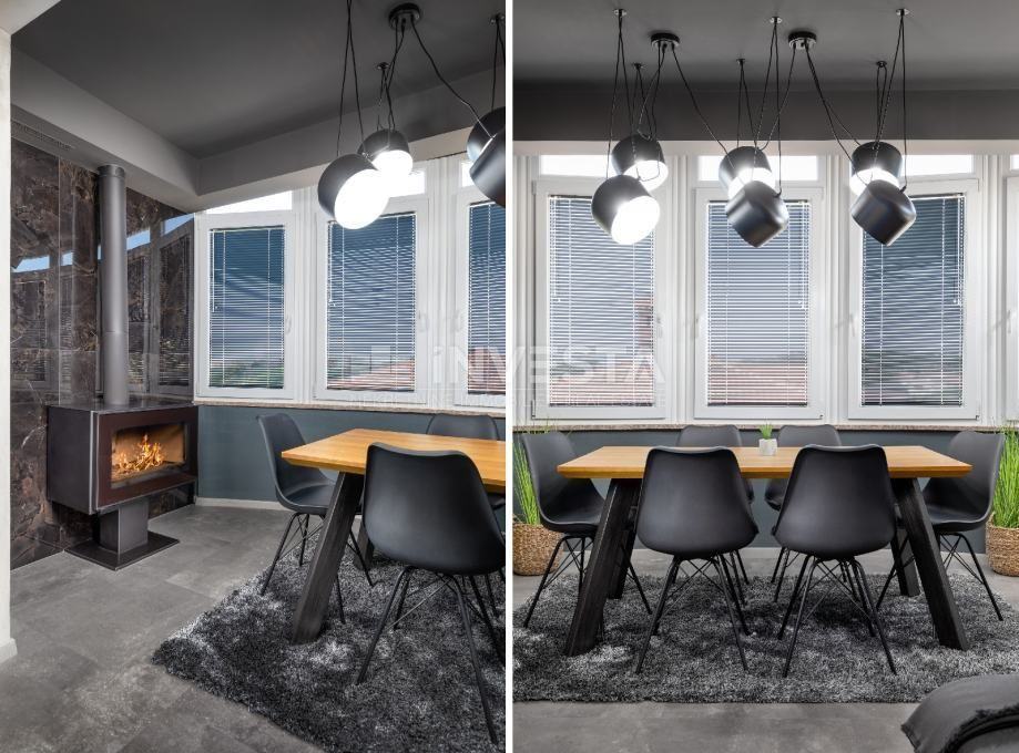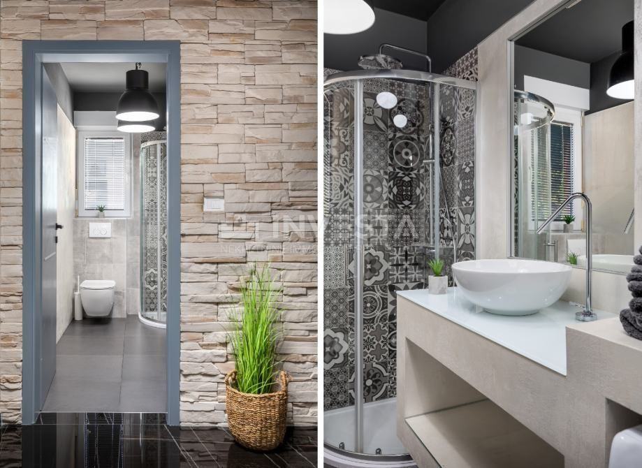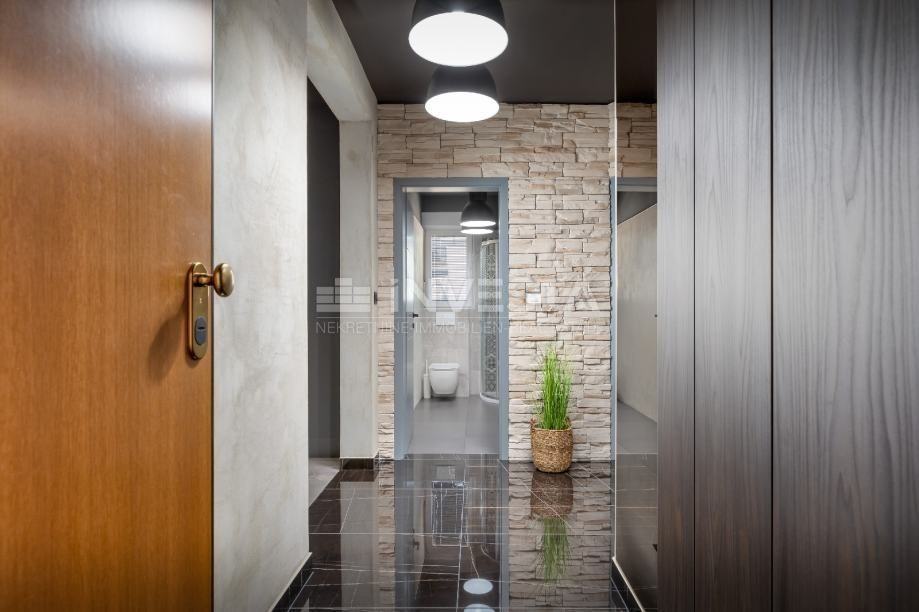 Sastoji se od ulaznog hodnika, open space dnevnog boravka sa kuhinjom, blagovaonom i pripojenom terasom, dvije spavaće sobe, od kojih jedna ima izlaz na mali balkon, kupatila te spremišta u podrumu zgrade. Stan je kompletno renoviran, postavljene su nove instalacije struje i vode, PVC stolarija, podovi, zidovi. Stan je uređen kvalitetnim dizajnerskim namještajem po mjeri i kao takav se prodaje. U posjedu stana je i jedno parkirno mjesto u dvorištu zgrade.