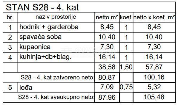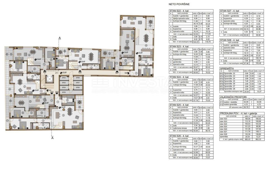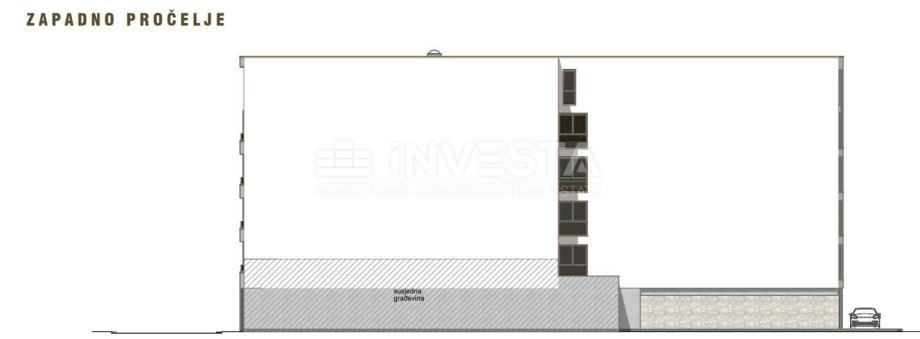 Na svakom katu stambene zgrade nalazi se sedam stambenih jedinica sa pripadajućim spremištima. U prizemlju zgrade nalazi se parking koji obuhvaća 33 parkirna mjesta. Spremišta i parkirna mjesta uračunata su u cijenu.