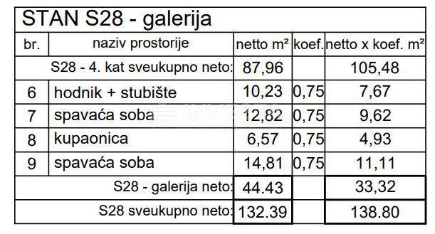 Dvoetažni stan, ukupne stambene površine 166 m2, nalazi se na četvrtom katu. Prva etaža stana sastoji se od ulaznog hodnika i garderobe, dnevnog boravka s kuhinjom i blagovaonom, dvije spavaće sobe i kupaonice, lođe te hodnika koji stubištem vodi do druge etaže (galerija) gdje se nalaze još dvije spavaće sobe i dvije kupaonica.