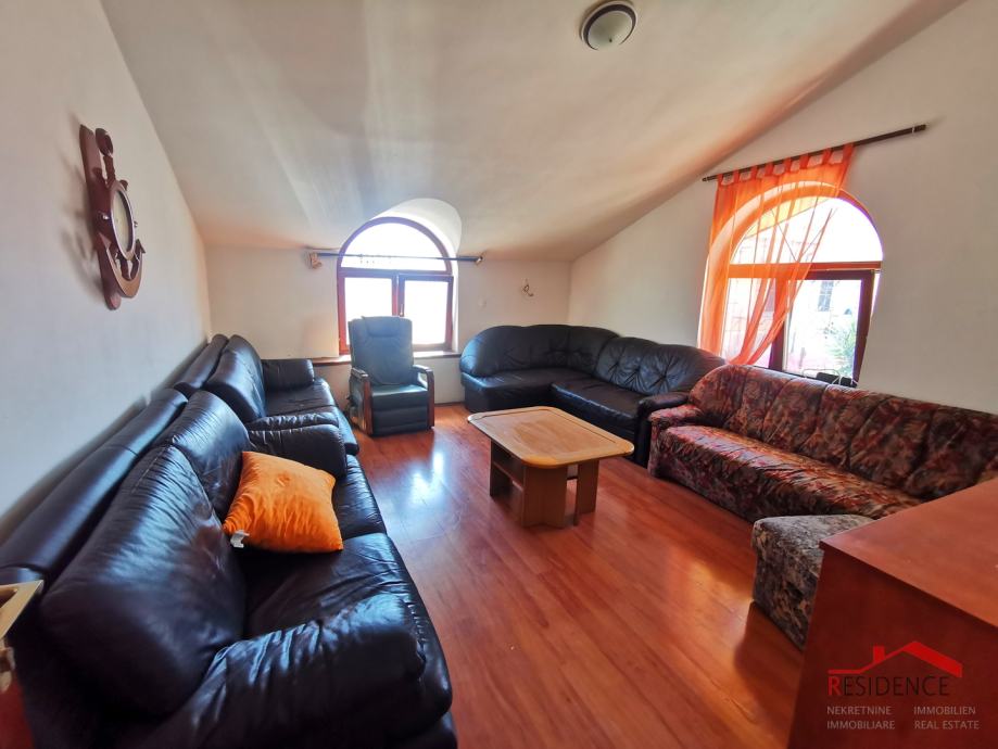 Stan na prvom katu površine 80 m2 sastoji se od hodnika, kuhinje + blagovaonice + dnevnog boravka, dvije spavaće sobe i kupaonice.