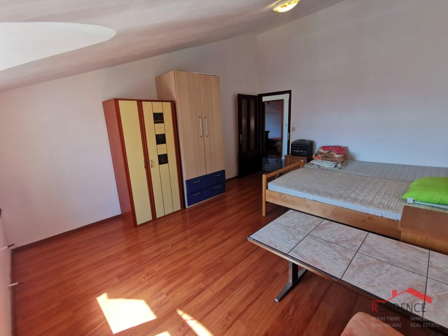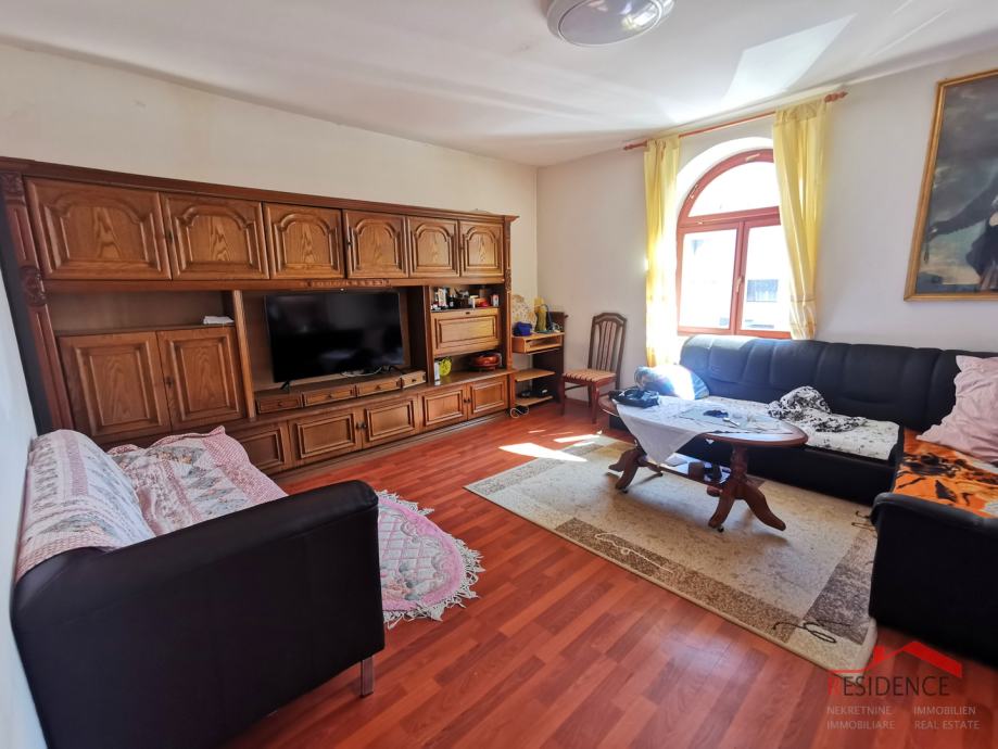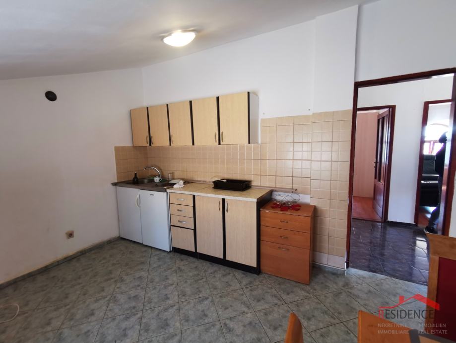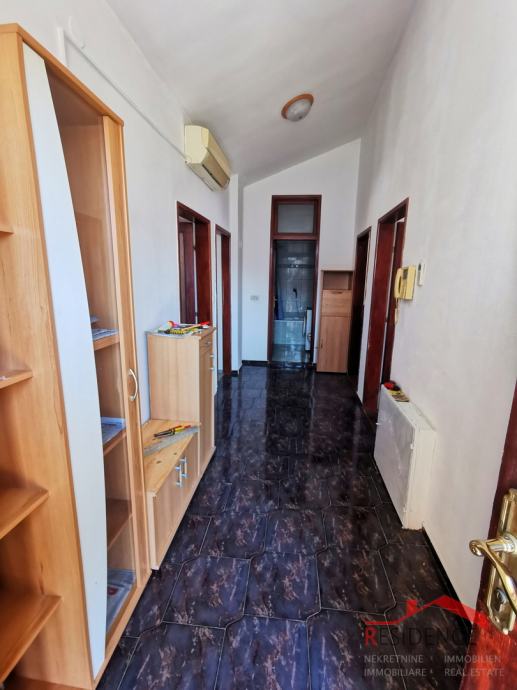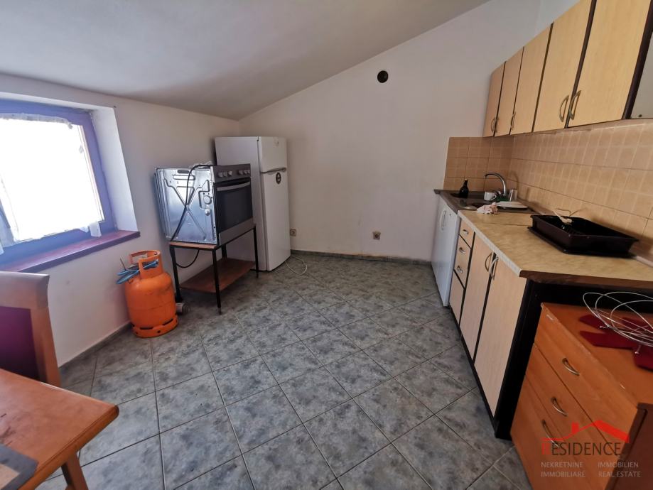 Stan u visokom prizemlju površine 80 m2 sastoji se od hodnika, kuhinje + blagovaonice + dnevnog boravka, dvije spavaće sobe i kupaonice.