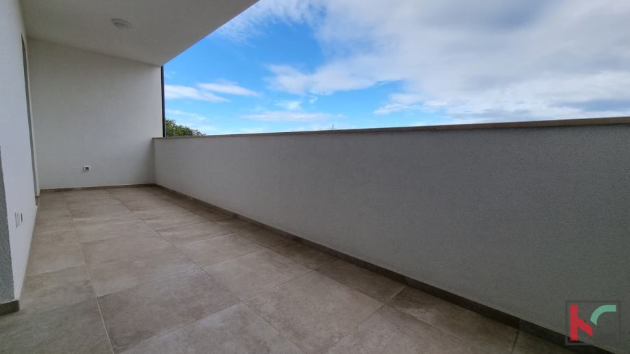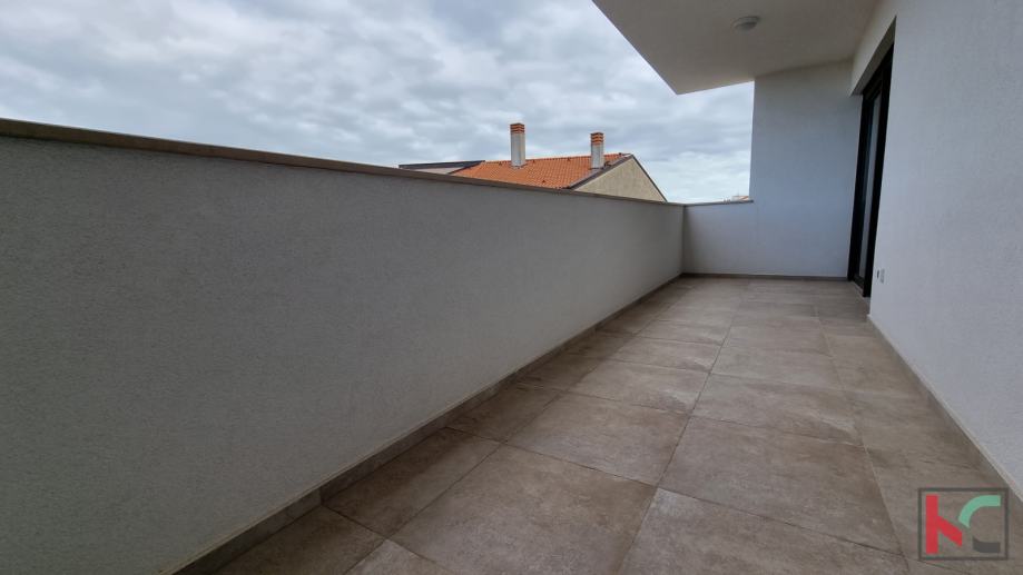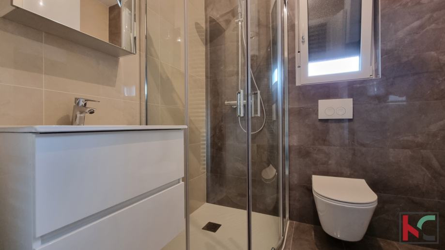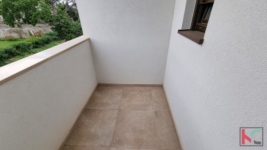 Idealna iskoristivost stambenog prostora, a sastoji se od ulaznog hodnika, prostranog dnevnog boravka sa kuhinjom, blagavaonicom, te izlazom na terasu sa koje se proteže pogled na more i amfiteatar, 3 komforne spavaće sobe, dodatnog balkona, 2 potpuno opremljene kupaonice, spremište, te privatnim parkingom u vlasništvu.