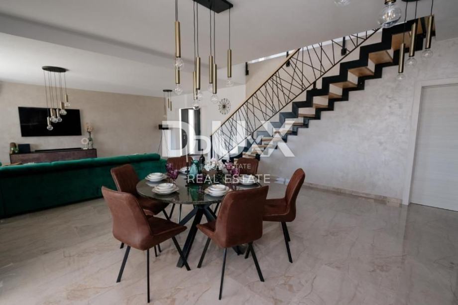 Središnji dio prizemlja čini impresivan, svijetlom okupan open space prostor u kojem se susreću moderna, potpuno opremljena kuhinja, prostrana blagovaonica i elegantan dnevni boravak. Velike staklene stijene brišu granicu između interijera i eksterijera te vode prema natkrivenoj terasi i bazenu, stvarajući savršen ambijent za uživanje tijekom cijele godine.